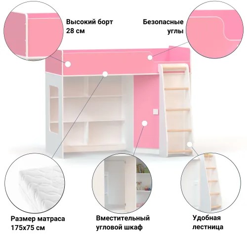 Отзывы о Столплит Кровать-чердак с угловым шкафом Ridgimmi 2.2 Белый/Розовый