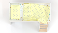 Верхний ярус оборудован спальным местом с высокими боковыми бортиками для безопасного сна и отдыха ребенка.