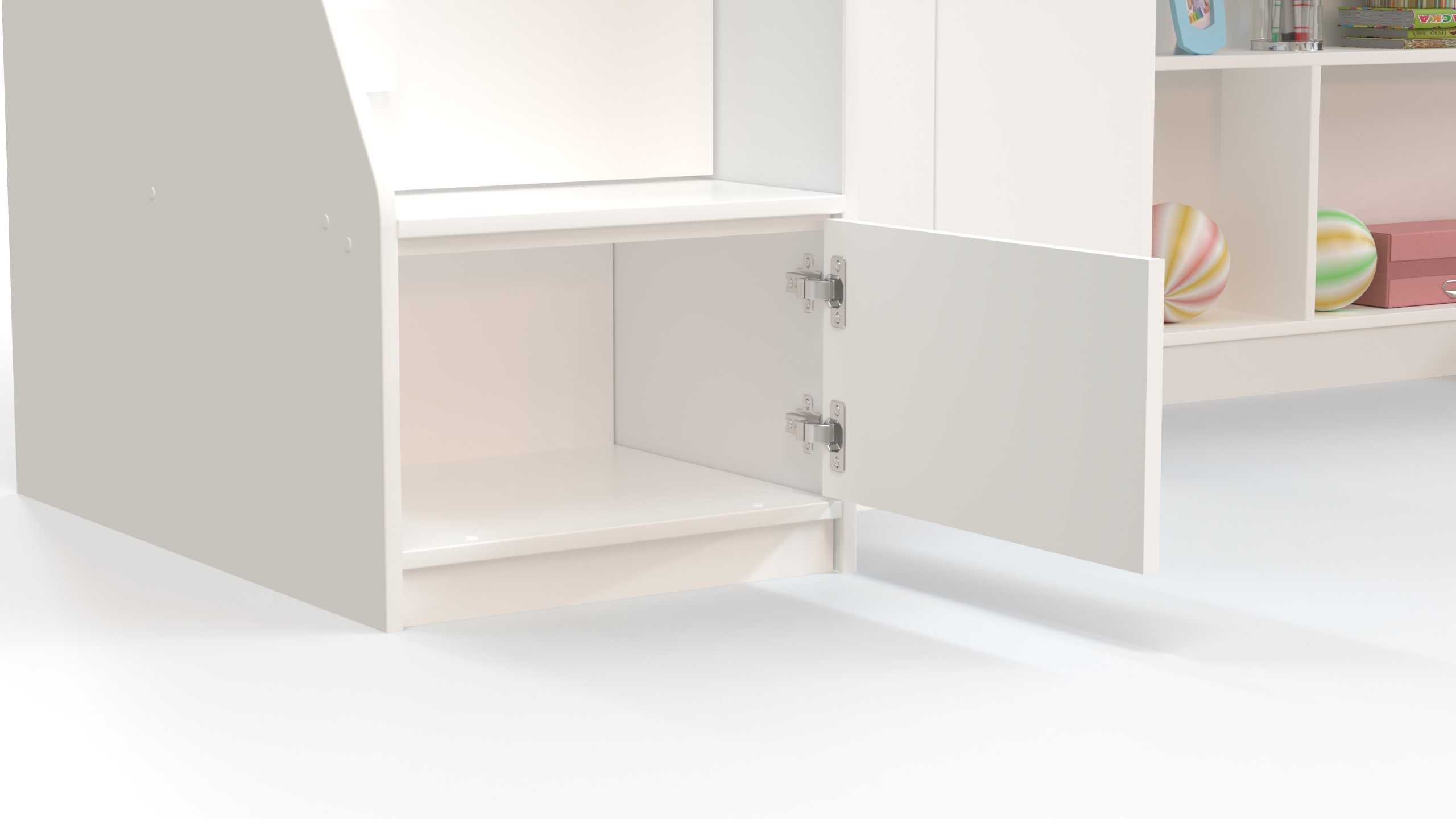 Для подъема и спуска предусмотрена трехступенчатая угловая лестница с нишами, оснащенная боковым бортиком. Лестница одновременно выполняет функцию стеллажа. Стеллаж оснащен фасадами - полки с дверками, как дополнительное место для хранения, с ручками плавной формы, без острых углов.