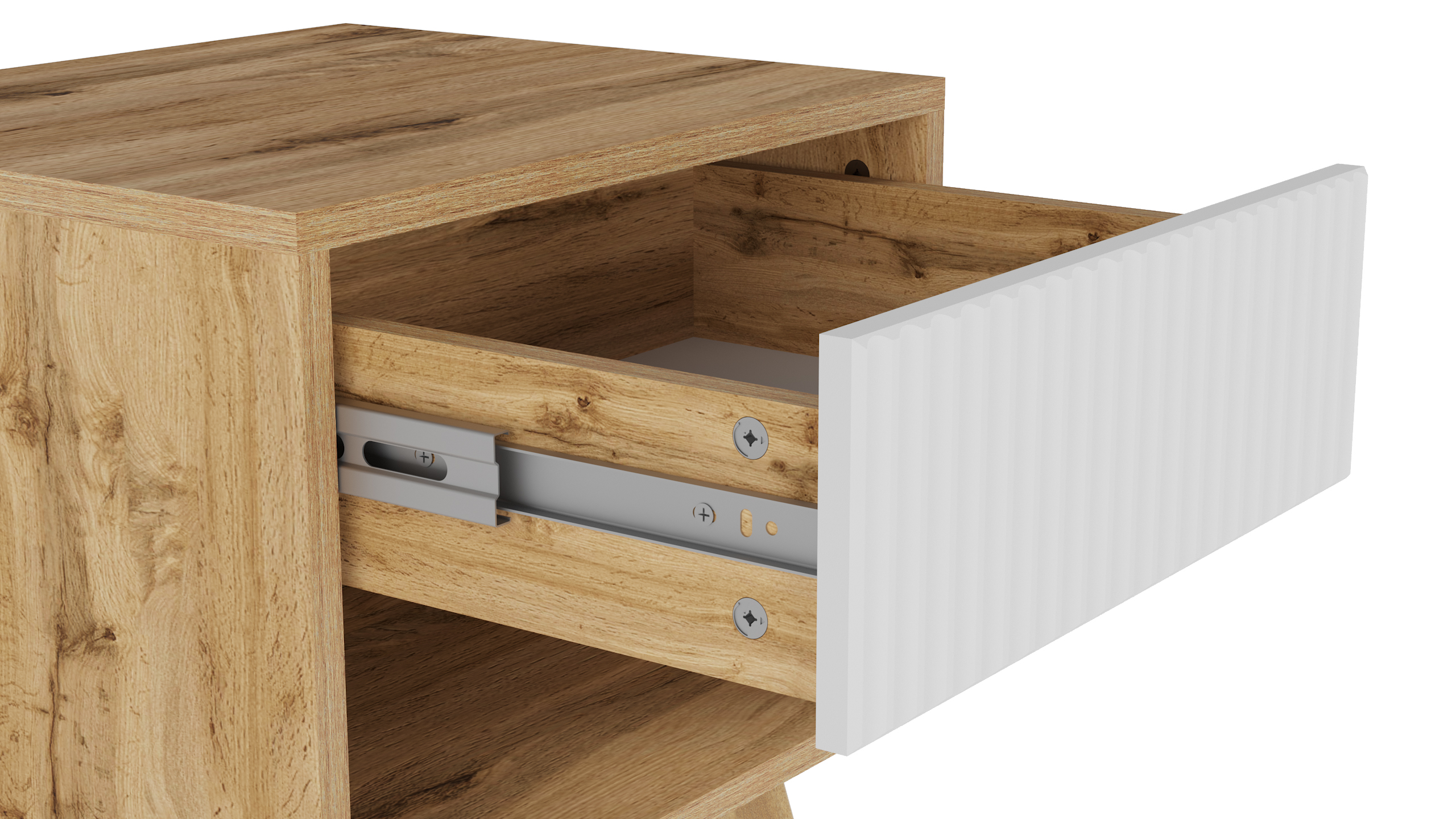 Тумба Хагги в сочетании цветов дуб вотан и белый идеально впишется в любой интерьер спальни, добавляя свежесть и элегантность вашему пространству. Эта тумба, произведенная из высококачественного ЛДСП, известного своей долговечностью и устойчивостью к механическим повреждениям, будет служить вам долгие годы. Тумба на ножках выглядит легкой и изящной, при этом не теряя своей функциональности и удобства в использовании. Белый фасад ящика создаёт утончённый контраст с текстурой древесины дуба вотан, придавая мебели современный и стильный вид. В этой тумбе встроен удобный и просторный ящик, который поможет вам организовать хранение различных мелочей и всегда держать их под рукой. Ее дизайн продуман до мелочей: плавные линии, качественные материалы, надежная фурнитура, благодаря которой ящик легко открывается и закрывается. Тумба Хагги станет не только функциональным элементом обстановки, но и настоящим украшением вашей спальни или гостиной. Эта стильная и практичная тумба подойдет как для классических, так и для современных интерьеров, легко дополняя существующую мебель. Независимо от того, используете ли вы её для хранения книг, ночных ламп или личных вещей, тумба Хагги полностью оправдает ваши ожидания.