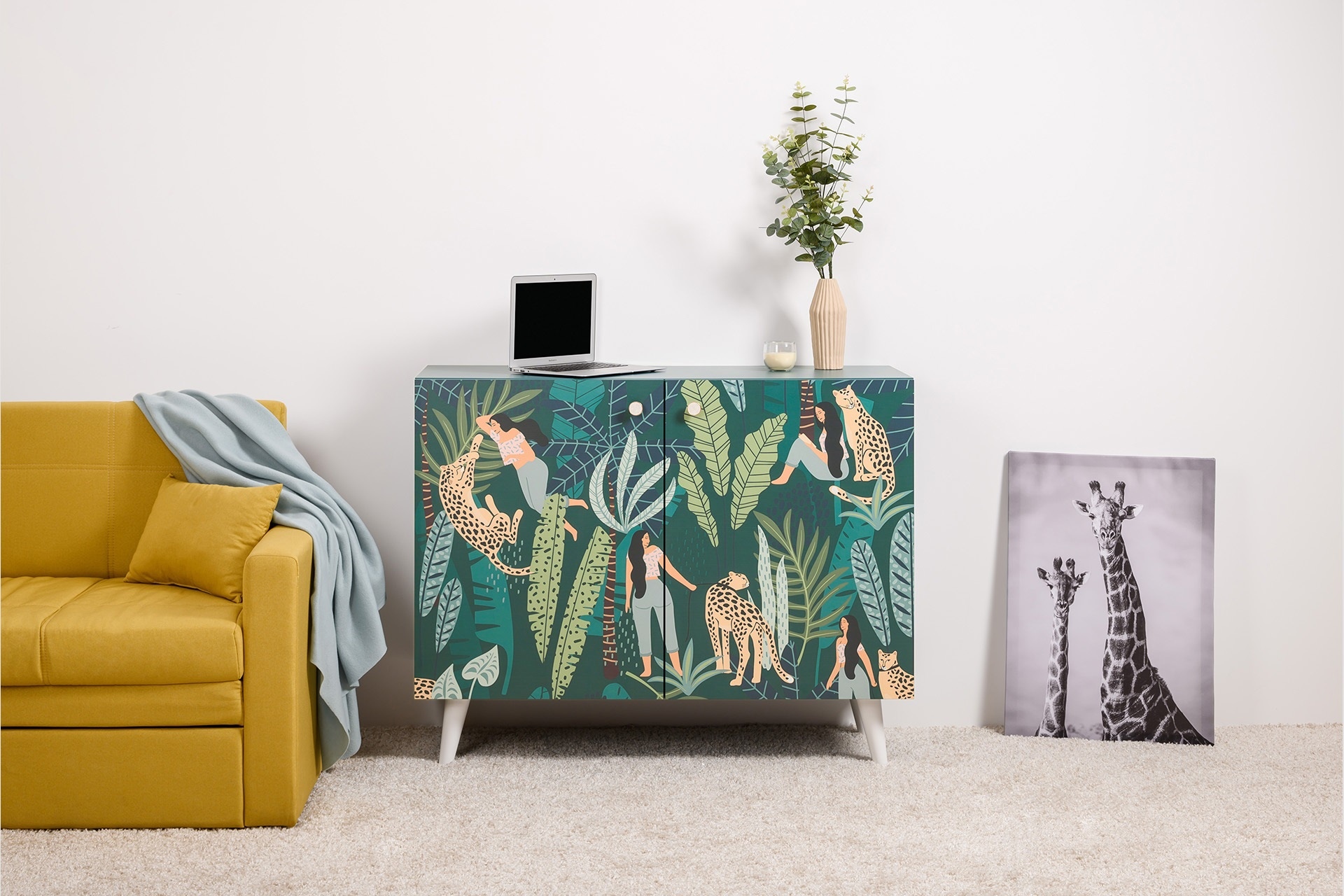 На фасадах трендовый принт с природными мотивами дарит ощущение спокойствия и переносит в атмосферу тропического леса. Модель оснащена двумя распашными дверками, скрывающими просторные отделения для хранения. Внутри пространство разделено четырьмя полками на 6 равных отделений.