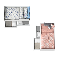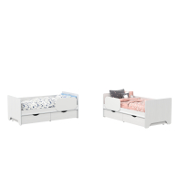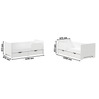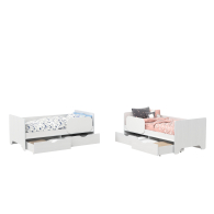 Устойчивая, надёжная конструкция, с боковыми стеночками, кровати Уна 11.22 допускает использование её для отдыха деток раннего возраста. Задний щит изолирует ребёнка от холодной стеночки. Спереди предусмотрены бортики, которые обеспечивают дополнительную безопасность ваших малышей во время сна. Спальное место 800х1600 мм., основание под матрас в комплекте (настил ЛДСП), матрас для этой кровати приобретается отдельно. В основании каждой кровати размещены два выдвижных ящика на роликах для постельных принадлежностей и личных вещей ребёнка. Трогательная прелесть белого цвета кроваток добавит эстетику чистоты и невинности в интерьерный дизайн детской. Все краевые элементы кроватей выполнены с травмобезоопасным закруглением, ящики открываются за специальный вырез на фасадах.