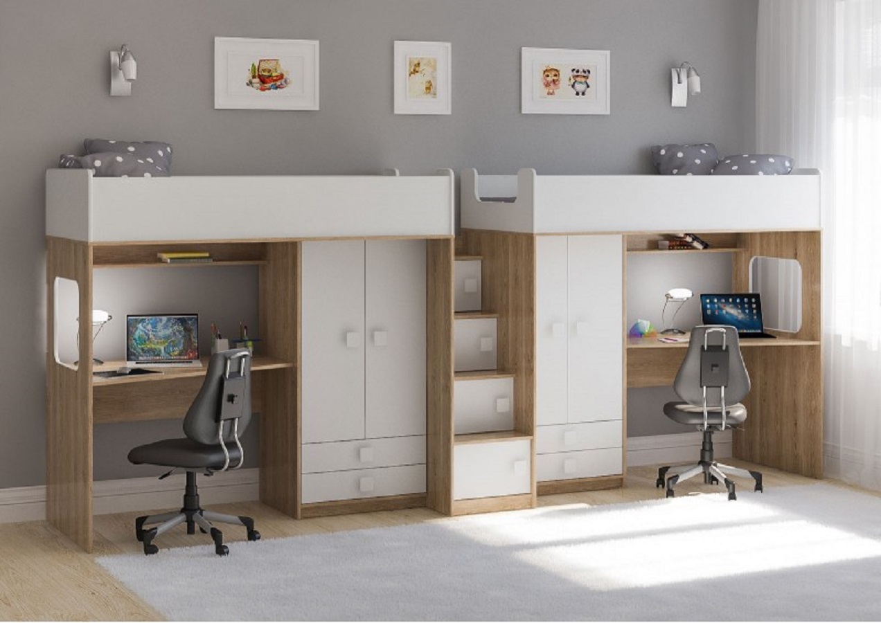 Двухъярусная кровать Легенда AA606-606 – полный набор для двоих детей.Две кровати Легенда A606 со спальным местом 1750х750 или 1900х750.Под спальным местом для каждого ребенка располагается рабочее место с встроенным столом.Вместительный шкаф для хранения одежды, белья,игрушек или иных вещей с двумя выдвижными ящиками.У каждого ребенка будет свой шкаф!Угловая лестница средней величины из четырех ступенек является связующим звеном,и в то же время разделяет зоны отдыха детей.Лестница, дополненная фасадами, одновременно выполняет функцию стеллажа.Две кровати, два шкафа, две игровых зоны – одна лестница. Идеальный вариант для двоих детей!
