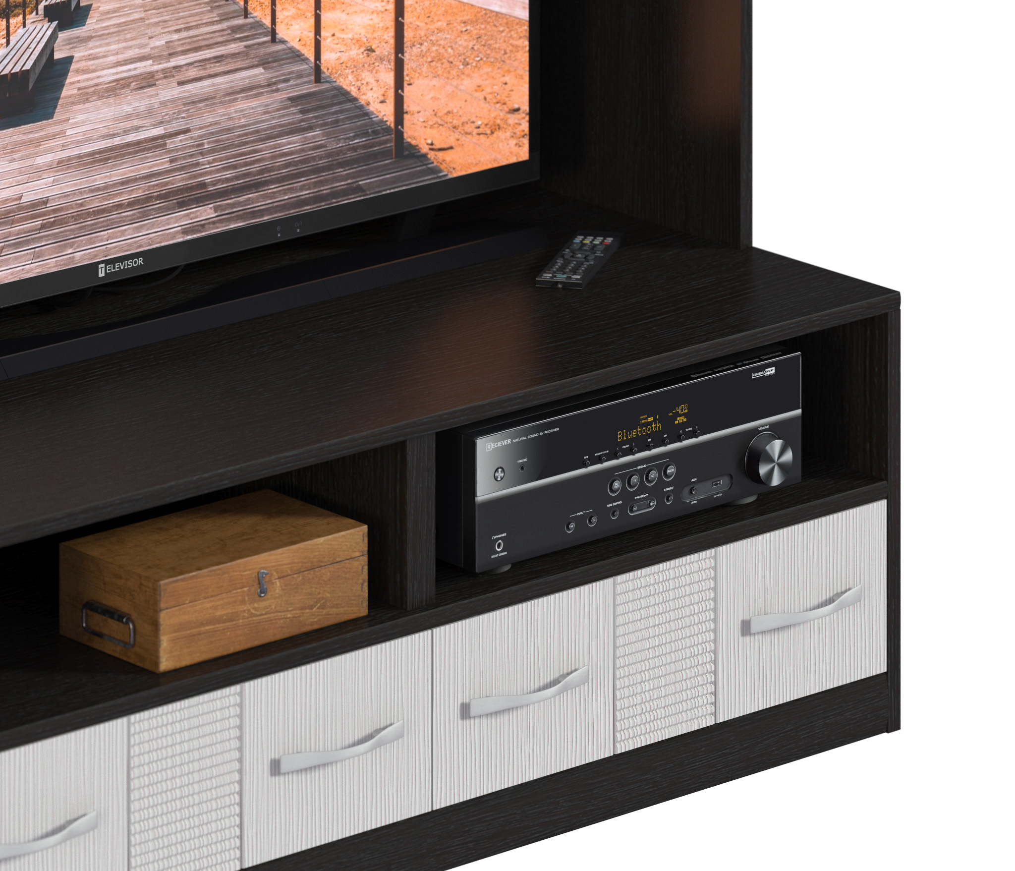 Габаритные размеры – ширина 120 см, высота 42 см и глубина 44 см. Визуально тумбу можно разделить на два симметричных отделения. В каждом отделении над вместительным выдвижным ящиком расположена открытая полка для видео или аудио техники. Корпус тумбы выполнен из современного и прочного материала КДСП, фасады - из МДФ. Отделка комбинированная – корпус в цвете «Дуб Феррара», фасады в цвете «Онденс». Материал отделки устойчив к влаге и воздействию бытовых чистящих средств.