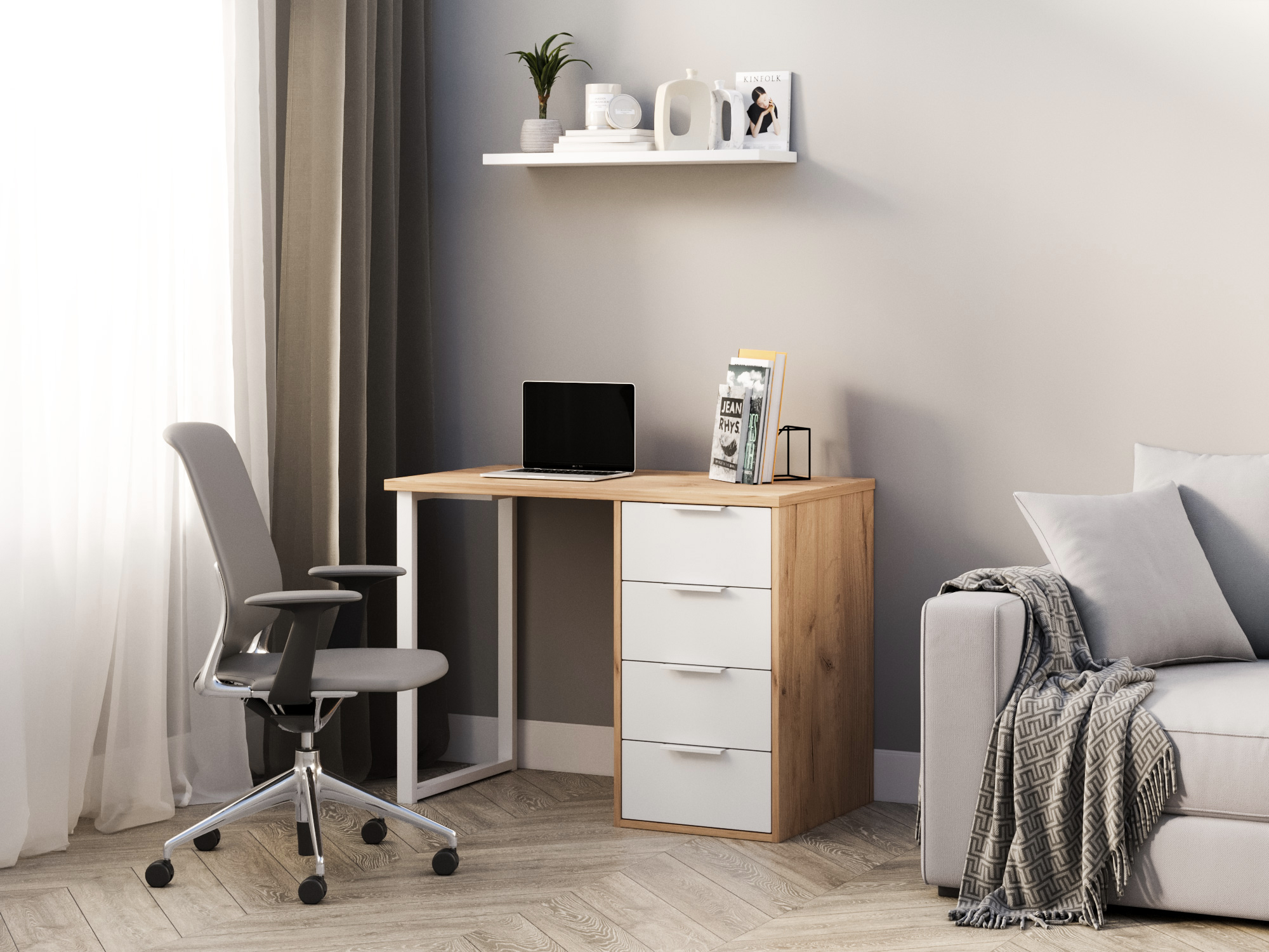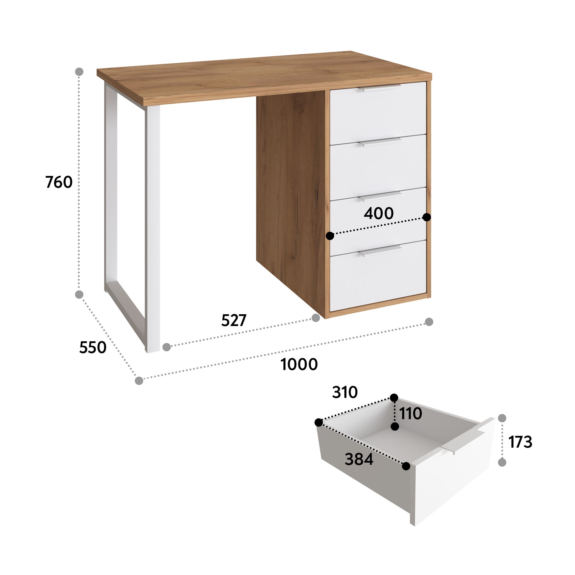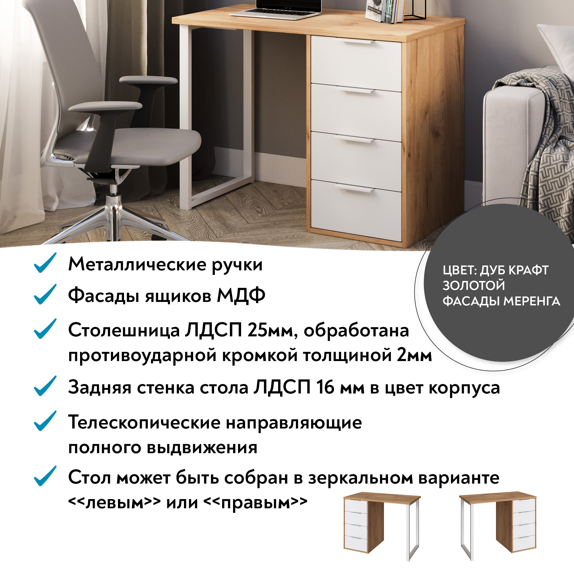 Стол компьютерный, письменный С-414 - это идеальное решение как для большого пространства, так и для небольшой комнаты. Стол прямой обеспечивает максимальную вместительность и удобство использования. Стол оснащен стильной металлической ножкой. Четыре выдвижные ящика - вместительны и комфортны в расположении. Не нужно никуда вставать, за важными документами или вещами, достаточно расположить все рядом с собой! Стол может быть собран в зеркальном варианте «правым» или «левым». Столешница изготовлена из ЛДСП 25 мм, фасады МДФ 16 мм. Дно ящика ДВП 3 мм. Фурнитура: ручки, опора металл, телескопические направляющие полного выдвижения без доводчиков.