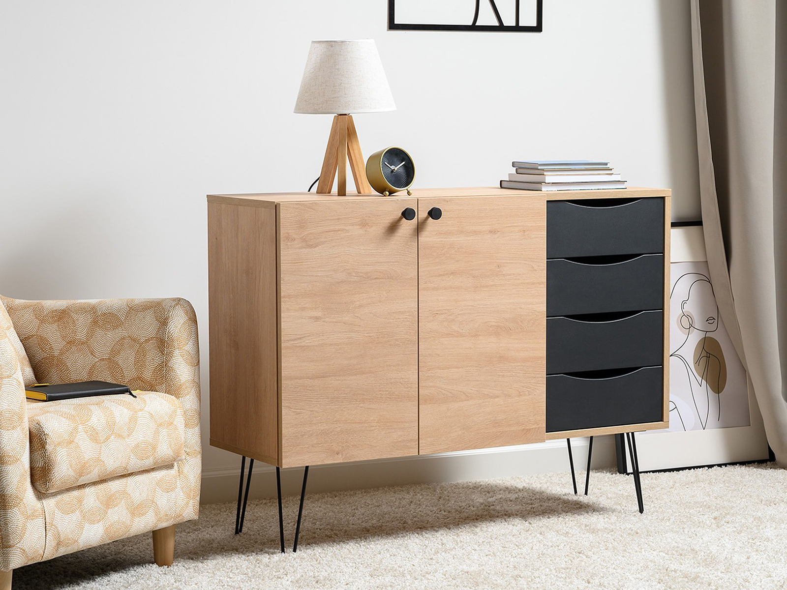 Выдвижные ящики оснащены шариковыми направляющими полного выдвижения, что позволяет удобно пользоваться всей глубиной. Петли дверок с доводчиками обеспечивают плавное и бесшумное закрытие, повышая комфорт использования. Съёмная полка внутри позволяет легко адаптировать пространство под любые нужды, увеличивая вариативность хранения. Высокие металлические опоры не только создают визуальную лёгкость, но и позволяют легко убирать под мебелью. Элегантные металлические ручки с черной накаткой добавляют эстетики и приятны на ощупь, завершая продуманный образ комода.