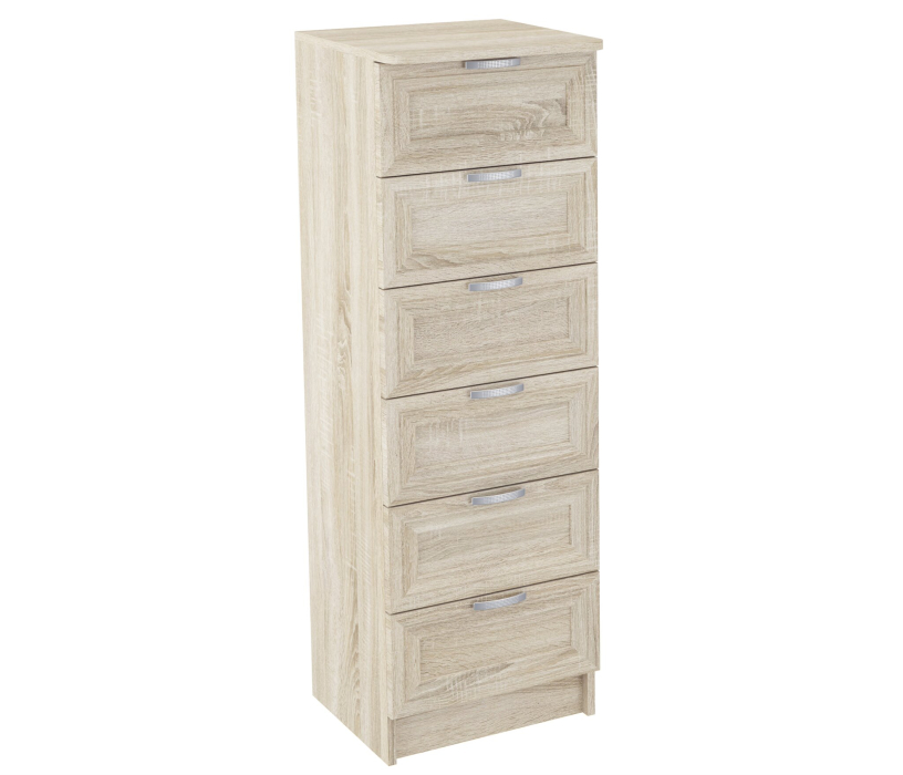 Комод 5 рамка удачно разработан,для маленьких помещений.Ширина всего 43 см,позволяет разместить в любом месте Вашего дома.А 6 выдвижных ящиков,помогут разместить множество разных вещей.Корпус из ЛДСП,фасады рамочные МДФ.Производитель оставляет за собой право менять фурнитуру.