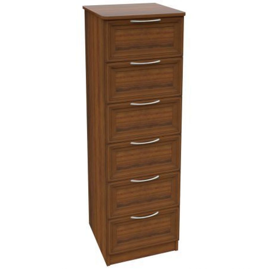 Комод 5 рамка удачно разработан,для маленьких помещений.Ширина всего 43 см,позволяет разместить в любом месте Вашего дома.А 6 выдвижных ящиков,помогут разместить множество разных вещей.Корпус из ЛДСП,фасады рамочные МДФ.Производитель оставляет за собой право менять фурнитуру.