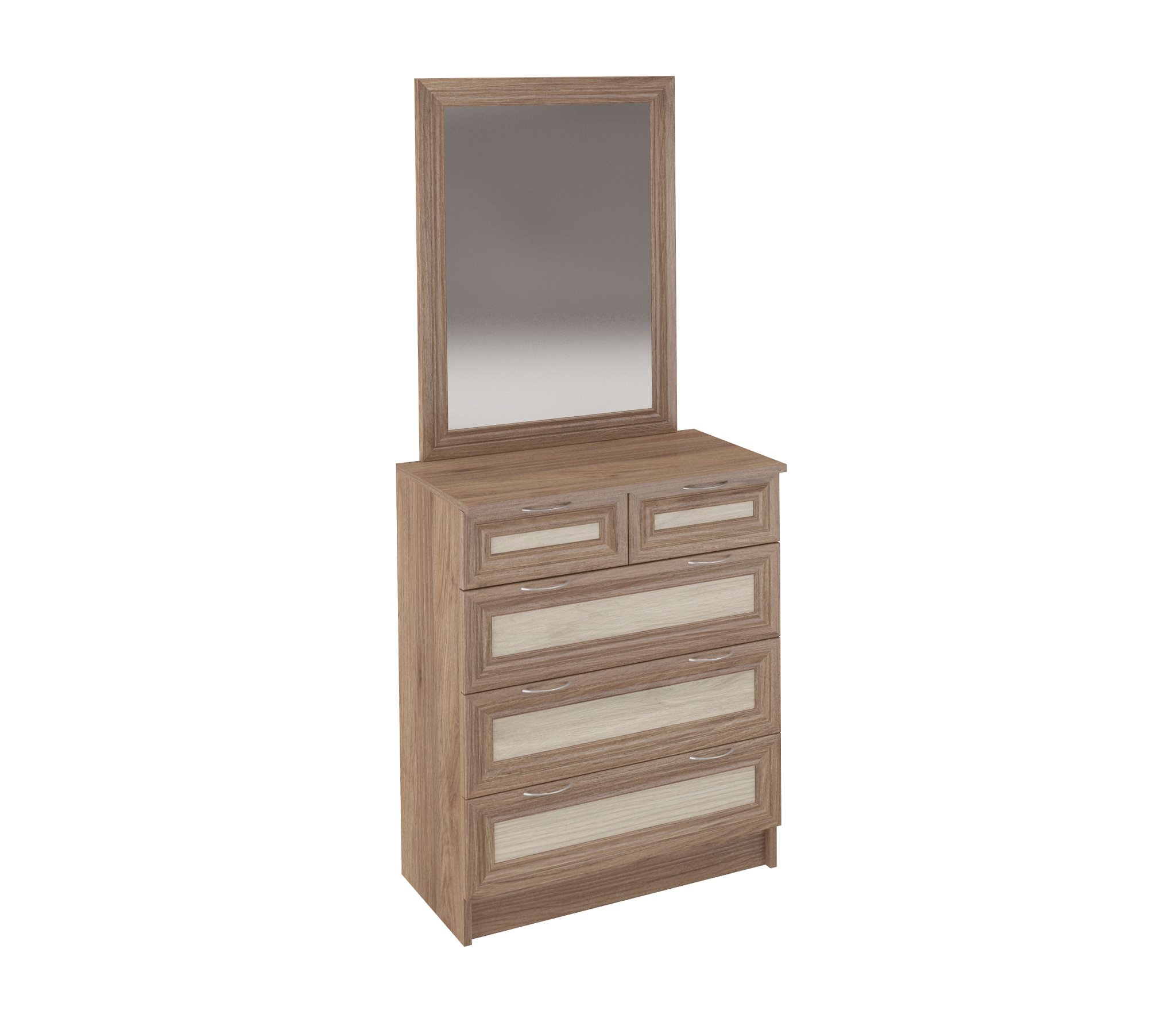 комод 6 с Зеркалом отличается не большими размерами,но хорошей вместимостью.Оснащён 4-мя большими и 2-мя маленькими выдвижными ящиками,позволяющими хранить множество вещей.Зеркало в рамке 60*80 см,вешается на стену.Удобно использовать как туалетный столик.Корпус из качественного ЛДСП,фасады рамочные МДФ.Производитель сохраняет за собой право менять фурнитуру.