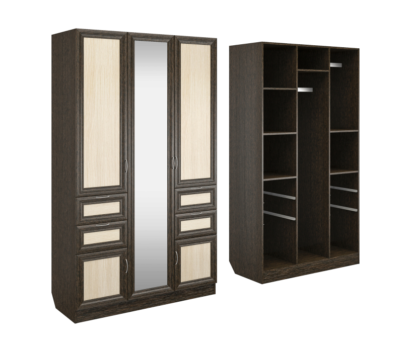 Корпус шкафа выполнен из Ламинированной ДСП высокого качества с насыщенным цветом. Фасады выполнены из материала МДФ.Большая и функциональная модель шириною 120 см., со множеством отделений закрытыми пятью распашными дверками. Вверху слева за дверью четыре ниши. Справа отделение со штангой и ниша внизу. Слева и Справа симметрично друг другу расположены по два выкатных ящика, и по две ниши с небольшими распашными дверцами. За центральной дверью большая, вертикальная секция со штангой для вешалок.В данной моделе установлено зеркало, которое вмонтировано на производстве в рамку фасада двери шкафа