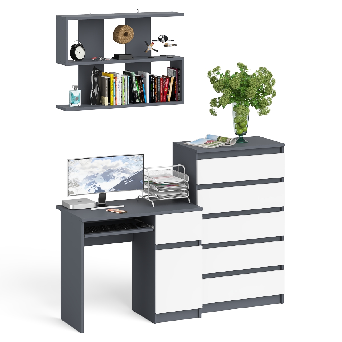 Комплектация включает стол Мори МС-1 правый компьютерный, узкий комод пять ящиков Мори МК700.5 и навесную полку Плк-900.