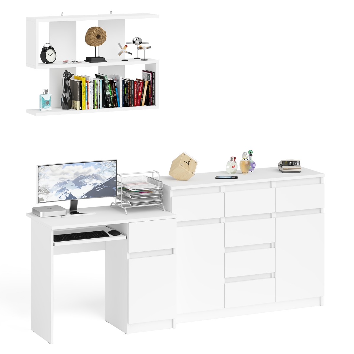 Комплектация включает стол Мори МС-1 правый компьютерный, комод с ящиками и дверками Мори МК1200.4 и навесную полку Плк-900.