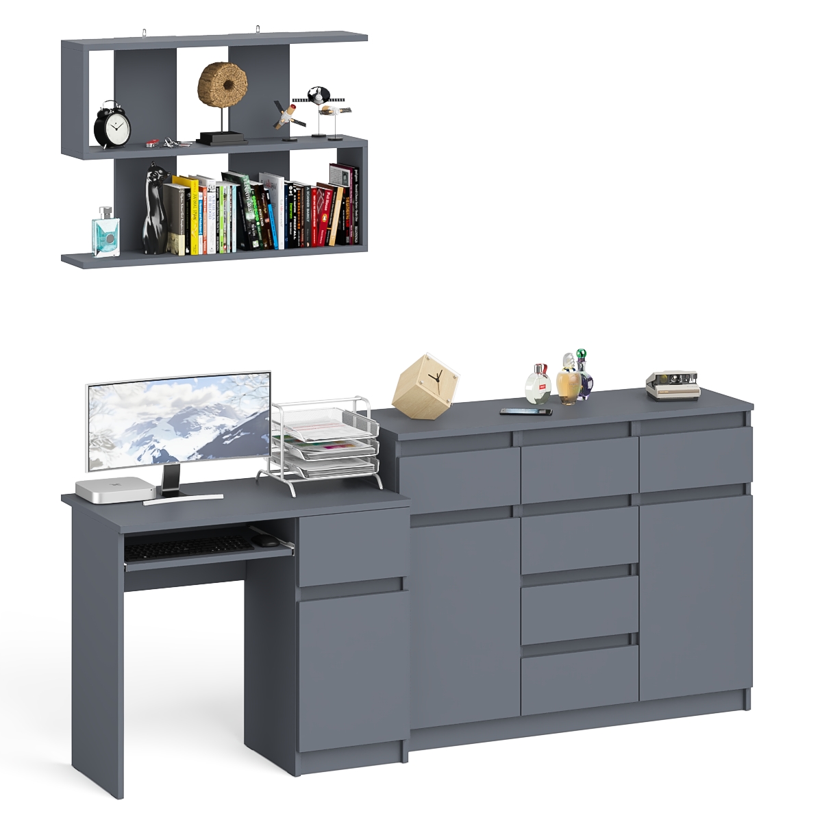 Комплектация включает стол Мори МС-1 правый компьютерный, комод с ящиками и дверками Мори МК1200.4 и навесную полку Плк-900.