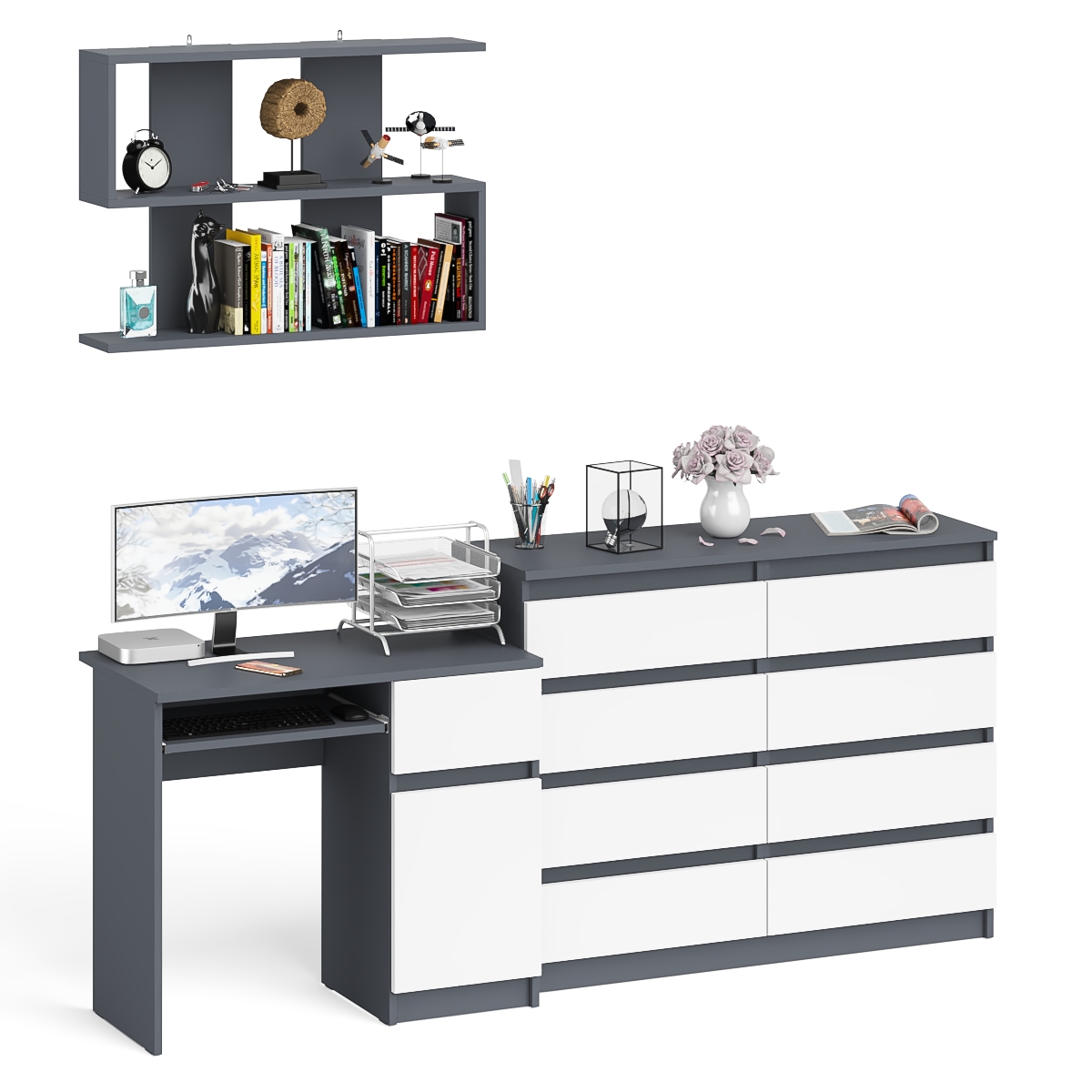 Большой комод на восемь выдвижных ящиков со столом МС-1 правый и полкой Мори 900 (Графит/Белый) Код I0000420763