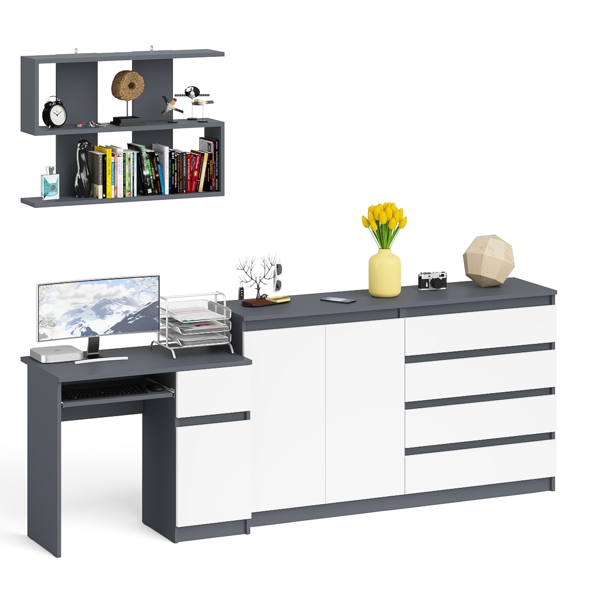 Отзывы о Столплит Тумба-комод с дверками и ящиками на 1600 со столом с тумбой и ящиком справа и навсеной полкой Мори Графит/Белый
