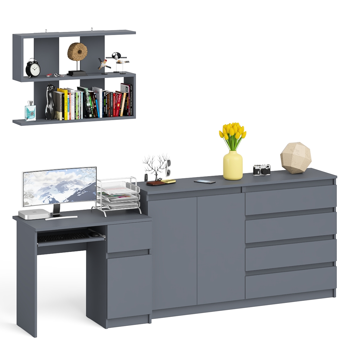 Комплектация включает стол Мори МС-1 правый компьютерный, комод широкий на четыре ящика и две дверки Мори МК1600.1 и навесную полку Плк-900.
