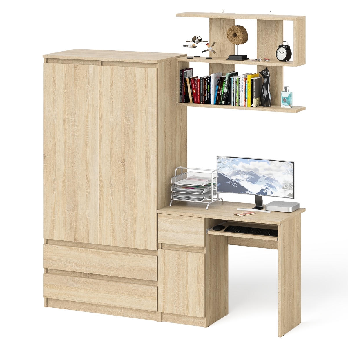 Комплектация включает стол компьютерный Мори МС-1 левый, шкаф-комод два ящика и две дверки Мори МШ900.1 и навесную полку Плк-900.