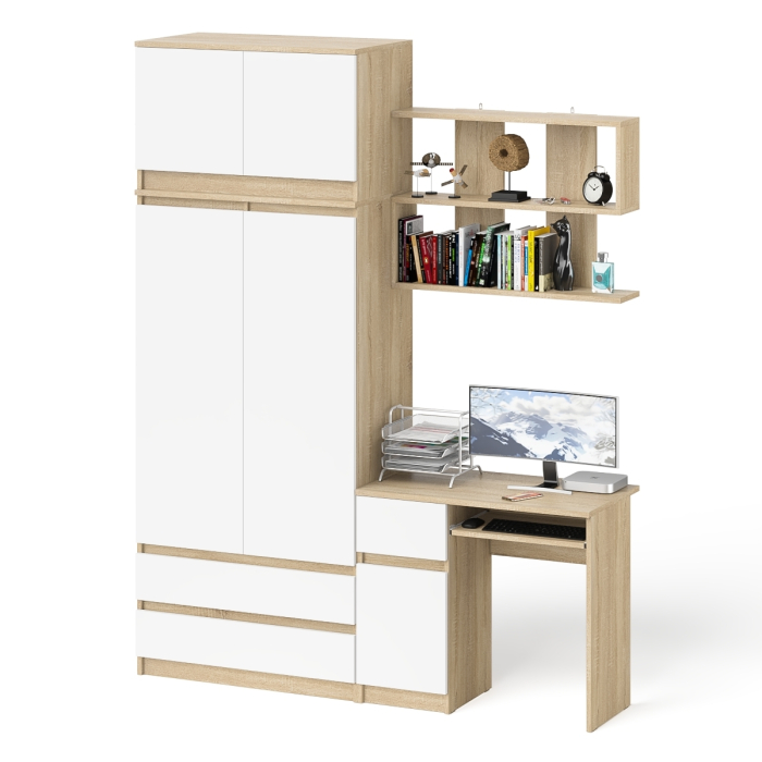 Отзывы о Столплит Стол однотумбовый Мори МС-1 левый с полкой навесной и комодом-шкафом с антресолью Дуб сонома светлый/Белый