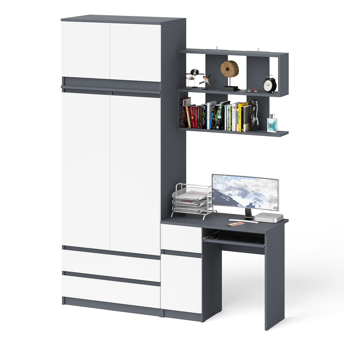 Отзывы о Столплит Стол однотумбовый Мори МС-1 левый с полкой навесной и комодом-шкафом с антресолью Графит/Белый