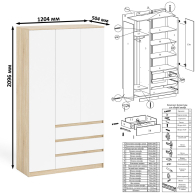 Широкий шкаф-комод Мори МШ1200.1. Оборудован тремя распашными дверями и тремя выдвижными ящиками. Слева за дверкой расположено отделение с горизонтальной штангой для одежды на плечиках, антресольной полкой и нижней нишей. Справа сверху за дверьми отделение с тремя полками и снизу тремя выдвижными ящиками. Шкаф-комод не универсален при сборке - отделение с ящиками располагается только справа. Открывание ящиков и малых дверей производится за счет пространства между планками и фасадами. Выдвижные ящики на роликовых направляющих L=400 мм. неполного выдвижения обеспечивают комфортную эксплуатацию. Открывание высокой створки двери шкафа производится за счет системы Push-to-open - простым нажатием на фасад.