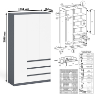 Широкий шкаф-комод Мори МШ1200.1. Оборудован тремя распашными дверями и тремя выдвижными ящиками. Слева за дверкой расположено отделение с горизонтальной штангой для одежды на плечиках, антресольной полкой и нижней нишей. Справа сверху за дверьми отделение с тремя полками и снизу тремя выдвижными ящиками. Шкаф-комод не универсален при сборке - отделение с ящиками располагается только справа. Открывание ящиков и малых дверей производится за счет пространства между планками и фасадами. Выдвижные ящики на роликовых направляющих L=400 мм. неполного выдвижения обеспечивают комфортную эксплуатацию. Открывание высокой створки двери шкафа производится за счет системы Push-to-open - простым нажатием на фасад.
