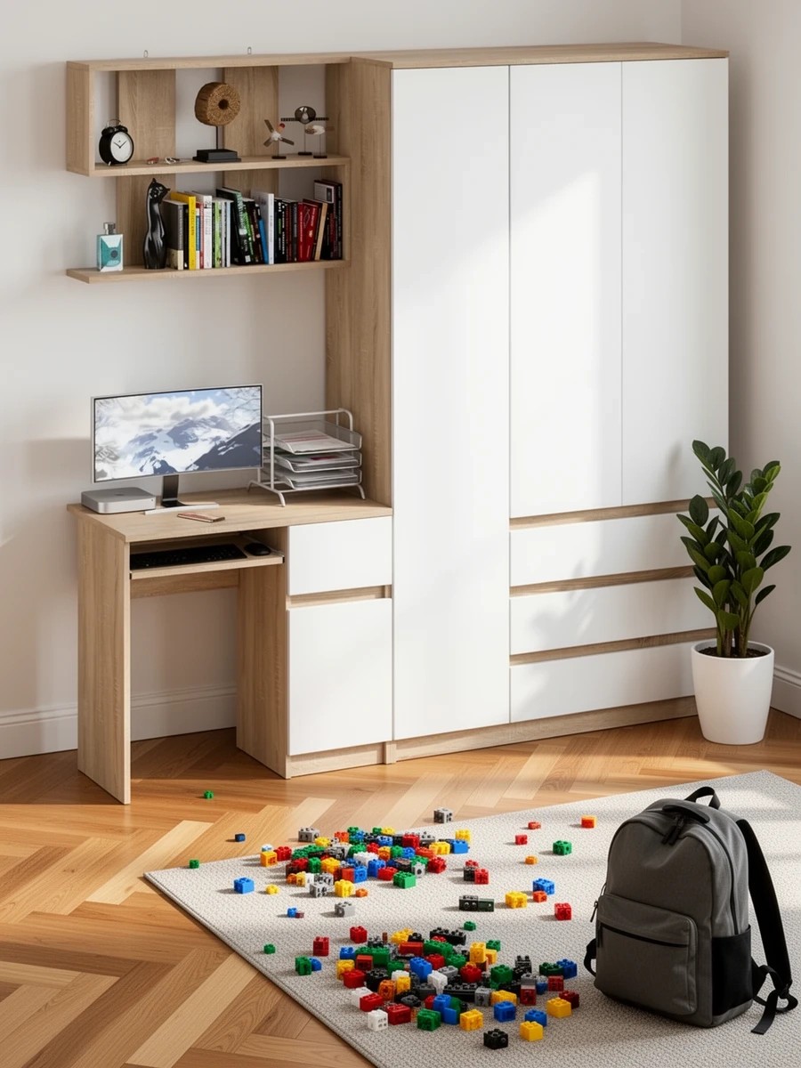 Комплектация включает стол Мори МС-1 правый компьютерный, широкий шкаф-комод Мори МШ1200.1 и навесную полку Плк-900.