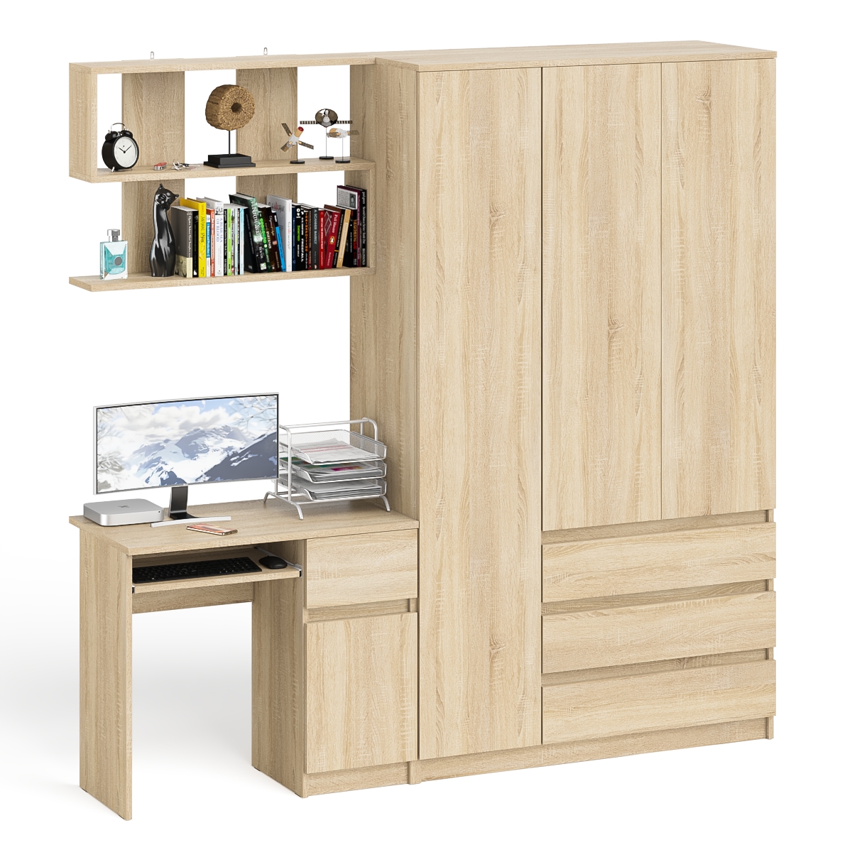 Комплектация включает стол Мори МС-1 правый компьютерный, широкий шкаф-комод Мори МШ1200.1 и навесную полку Плк-900.