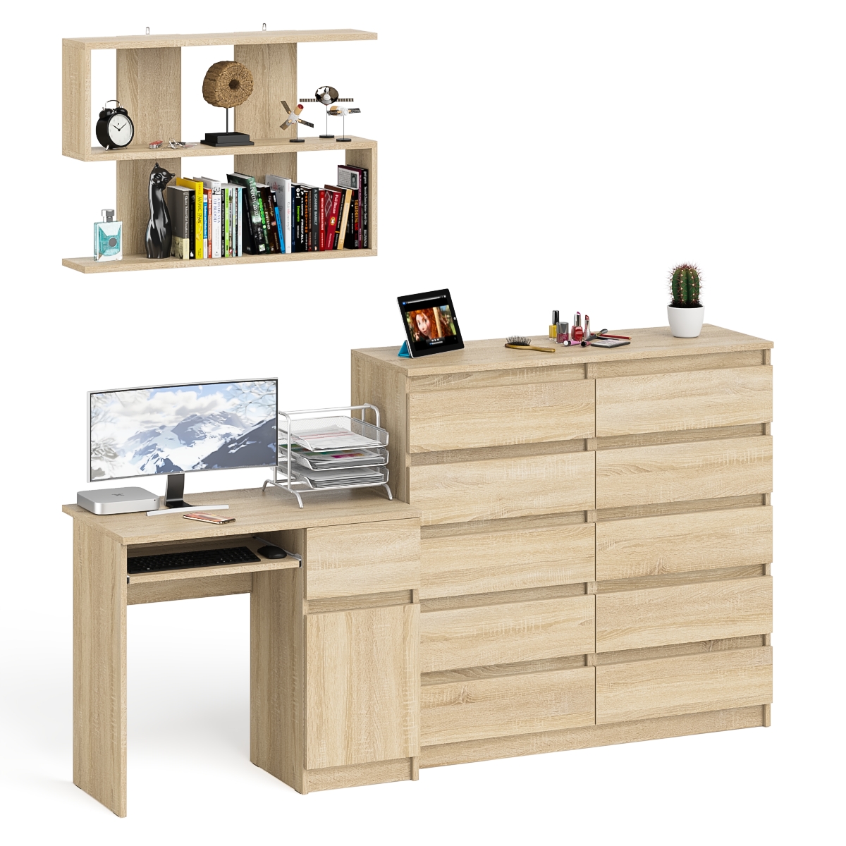 Комплектация включает стол Мори МС-1 правый компьютерный, комод высокий на десять выдвижных ящиков Мори МК1200.10 и навесную полку Плк-900.