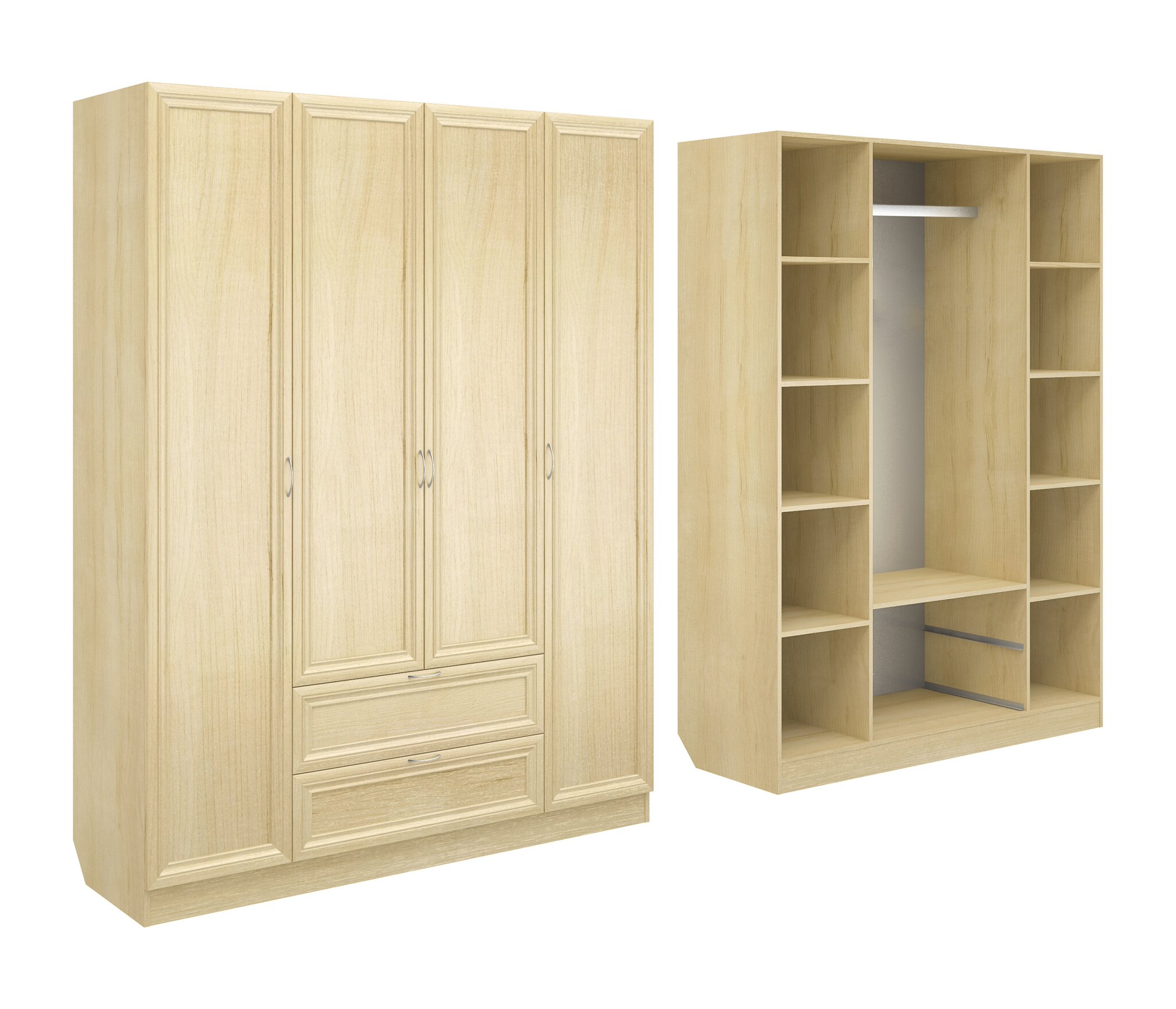 Корпус шкафа выполнен из Ламинированной ДСП высокого качества с насыщенным цветом. Фасады выполнены из материала МДФ.Шириною 160 см., красивый четырехстворчатый шкаф. Слева и справа секции, по четыре полки в каждой.