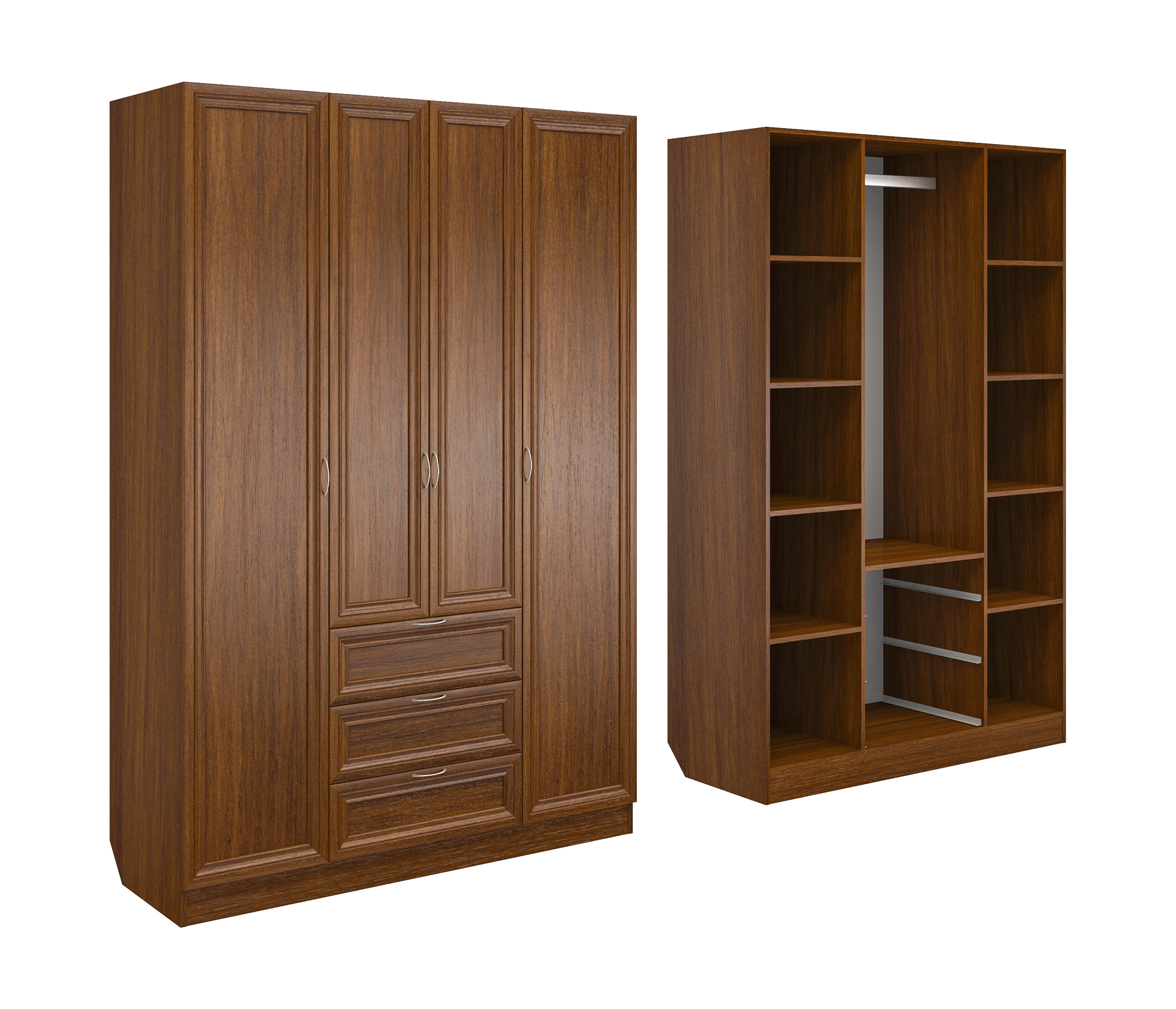 Корпус шкафа выполнен из Ламинированной ДСП высокого качества с насыщенным цветом. Фасады выполнены из материала МДФ.Шириною 140 см., красивый, удобный и очень функциональный четырехстворчатый шкаф. По краям слева и справа секции по четыре полки в каждой. В центре сверху узкая ниша, под ней большая секция со штангой для одежды. В самом низу встроены три выдвижных ящика.