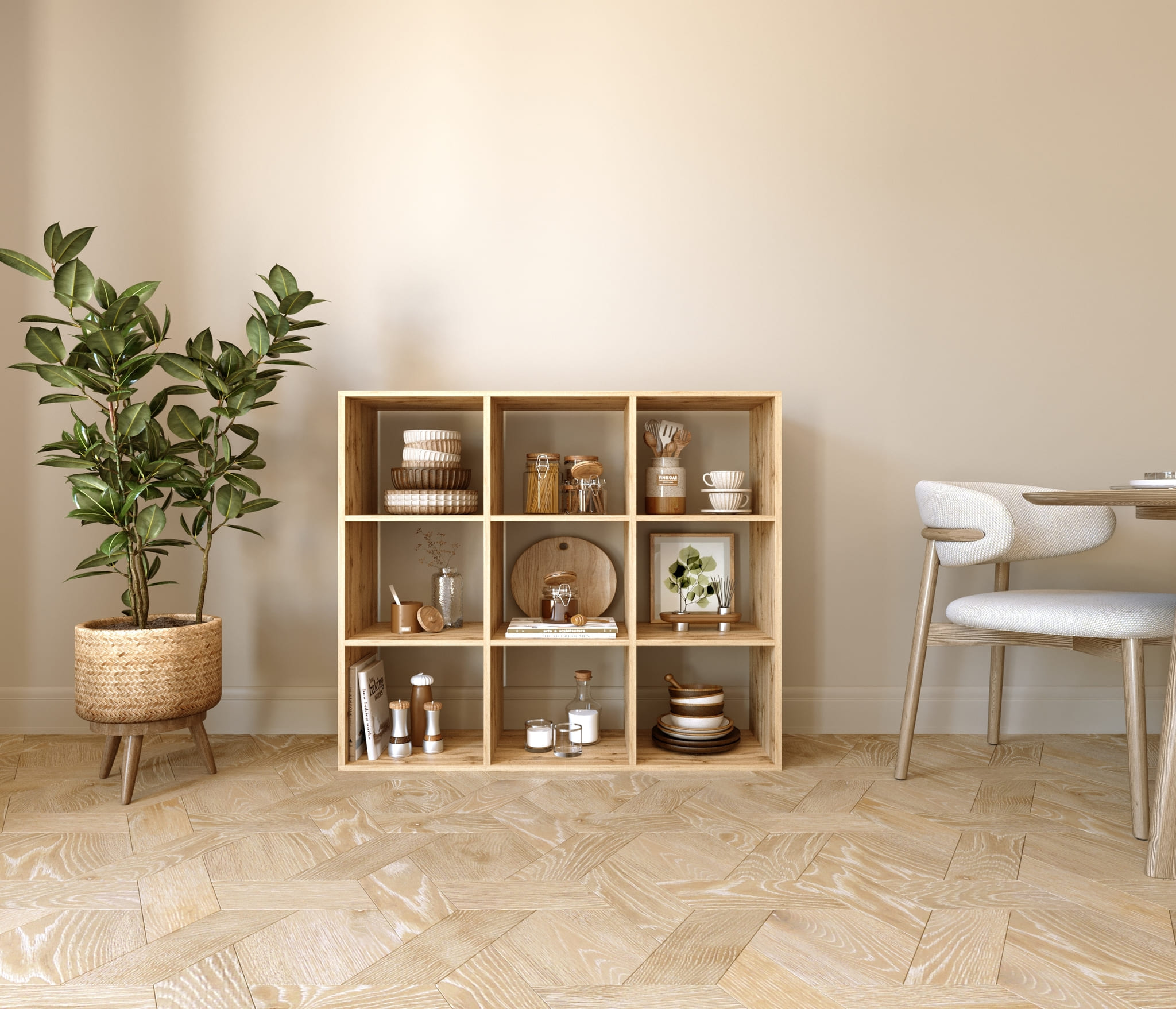 Стеллаж П-9 изготовлен из ламинированной ДСП 16 мм.Состоит из 12-ти равных отсеков кубической формы.Можно использовать как напольный элемент для разных целей.Высотой 1054 мм,шир 1054 мм и глуб 330 мм,он компактен и удобен в расположении.