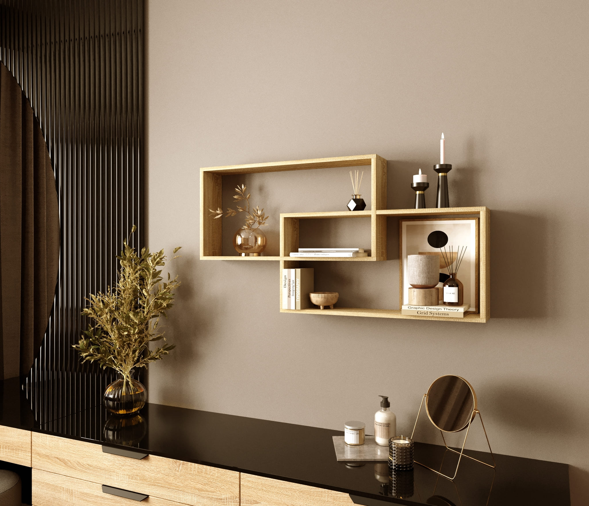 Полка настенная П-10 изготовлена из ламинированной ДСП 16 мм..Высотой 628 мм,шир 1040 мм и глуб 200 мм имеет 3 отсека различной формы для хранения разных вещей.
