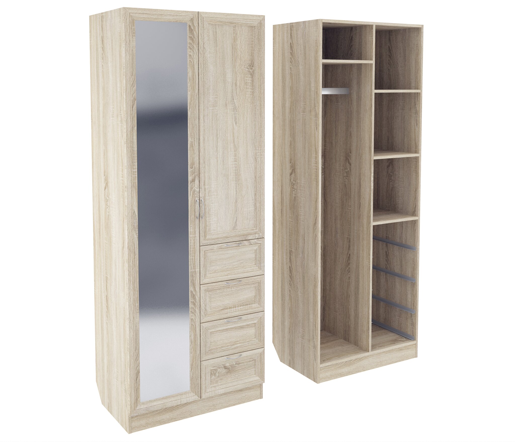 Корпус шкафа выполнен из Ламинированной ДСП высшего качества с насыщенным цветом. Фасады выполнены из материала МДФ.Ширина шкафа 80 см., эта многофункциональная модель несет в себе следующие элементы. Слева за распашной дверью с зеркалом располагается штанга для одежды, вверху ниша. Справа за дверью три ниши, а внизу четыре выдвижных ящика как у комода.В данной моделе установлено зеркало, которое монтируется на производстве в рамку фасада двери шкафа