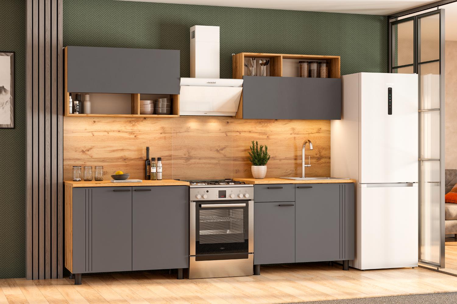 Цветовое решение: дуб золотой, графит— добавит изысканности и стиля интерьеру. Гарнитур состоит из удобных шкафов, ящиков и столешниц, обеспечивая максимальную функциональность и комфорт при готовке.