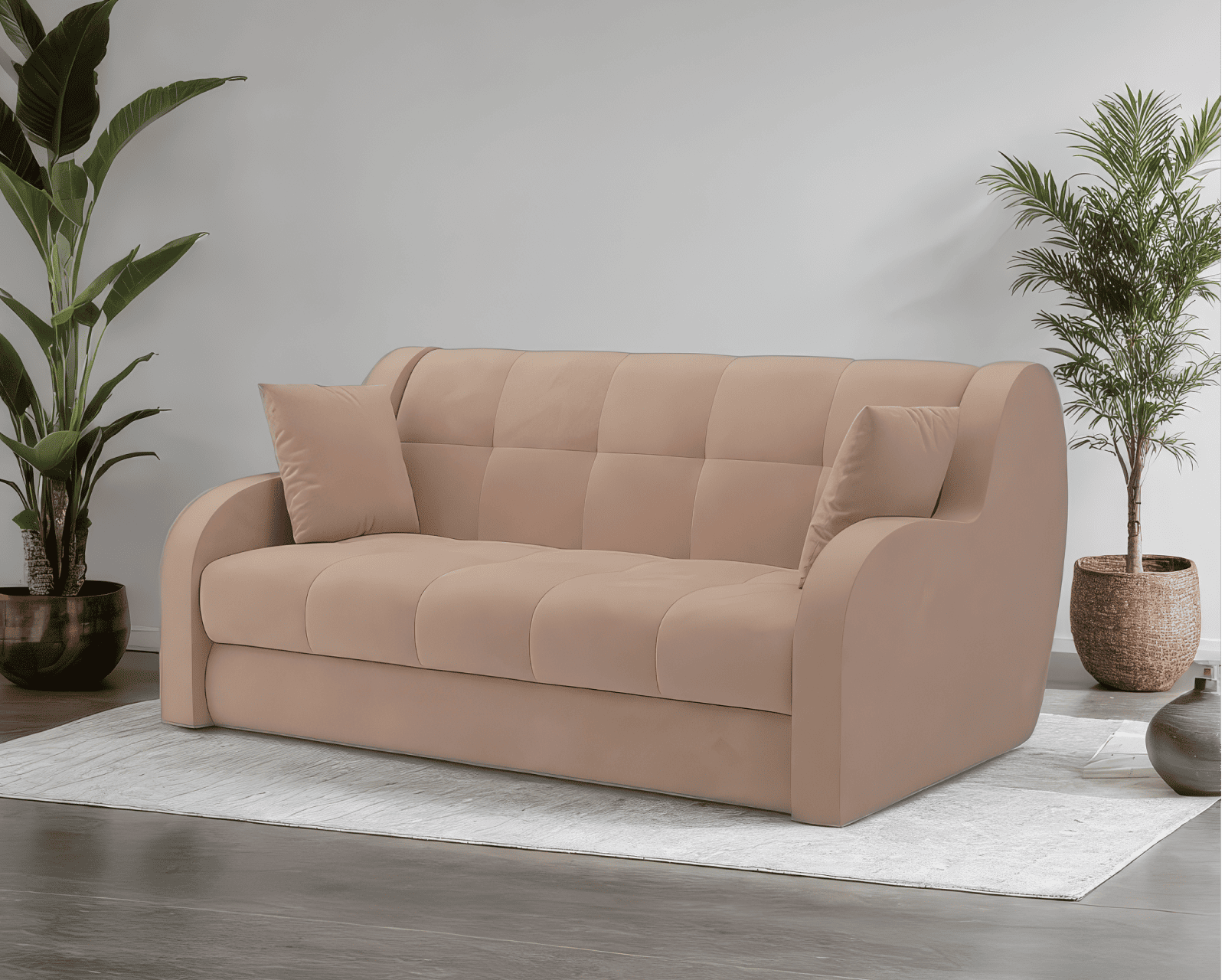 Плавные формы подлокотников в сочетании с геометрическим декорированием обивки придают дивану элегантности, легкости, позволяют гармонично сочетаться с мебелью в разных стилях, не перегружая интерьер. В собранном виде диван «Барон» выглядит аккуратно, достаточно компактно, не создает визуального шума. Пара декоративных подушек без узоров дополняют лаконичный дизайн дивана.