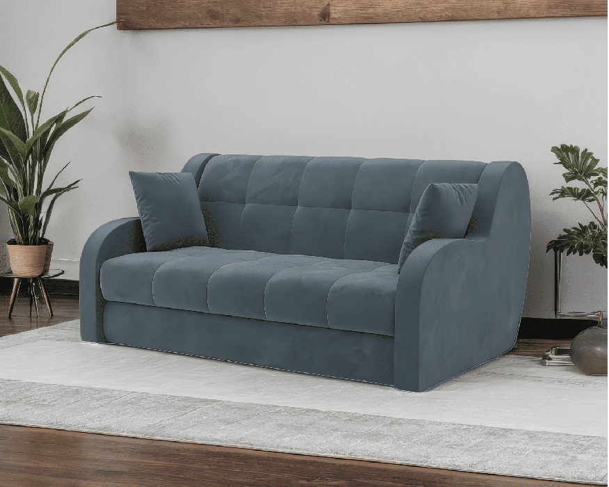Плавные формы подлокотников в сочетании с геометрическим декорированием обивки придают дивану элегантности, легкости, позволяют гармонично сочетаться с мебелью в разных стилях, не перегружая интерьер. В собранном виде диван «Барон» выглядит аккуратно, достаточно компактно, не создает визуального шума. Пара декоративных подушек без узоров дополняют лаконичный дизайн дивана.