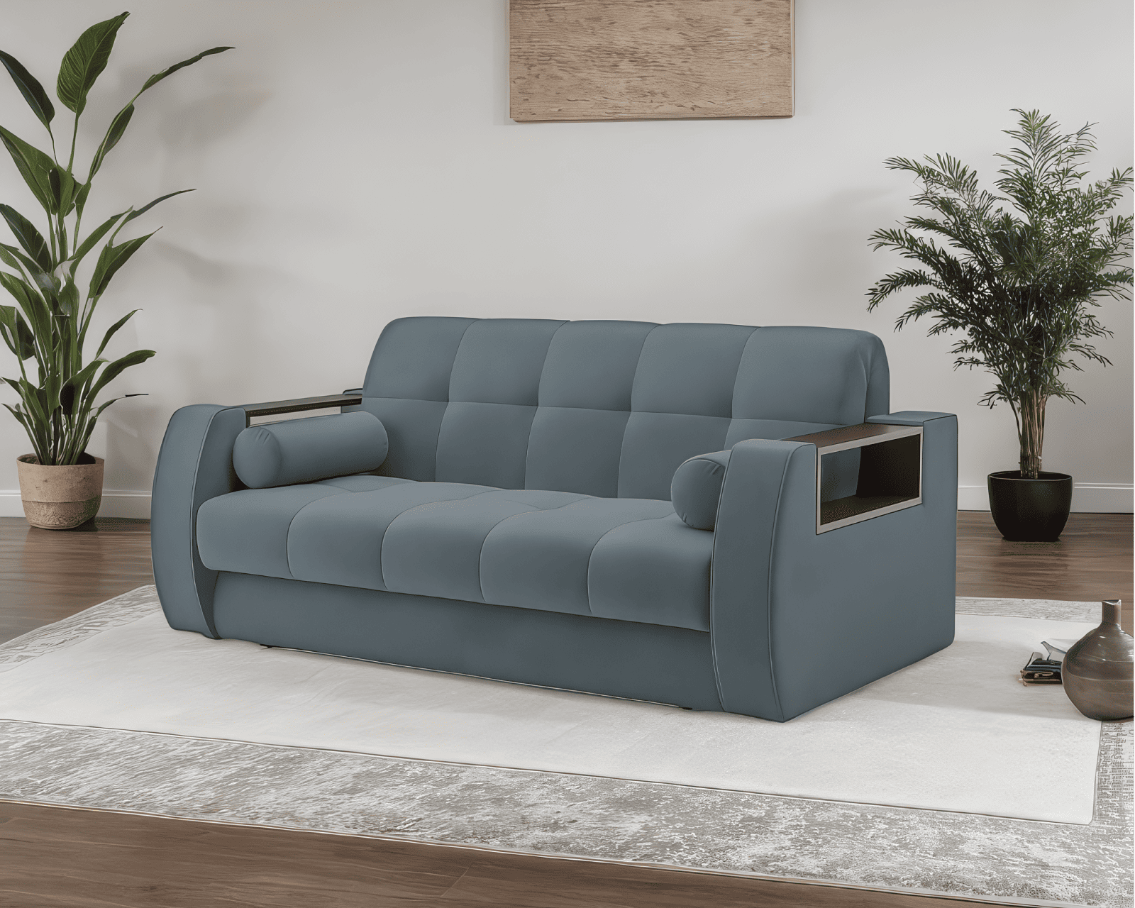 Особенностью модели являются встроенные в подлокотники, удобные полочки, выполненные из ЛДСП цвета темного Венге. Со встроенными полками можно сложить под рукой все необходимое и в одном месте — пульт от телевизора, наушники, зарядное устройство, стопку книг.