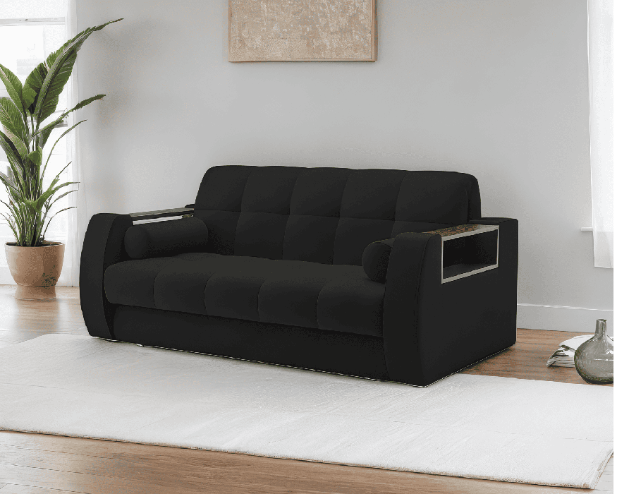 Особенностью модели являются встроенные в подлокотники, удобные полочки, выполненные из ЛДСП цвета темного Венге. Со встроенными полками можно сложить под рукой все необходимое и в одном месте — пульт от телевизора, наушники, зарядное устройство, стопку книг.