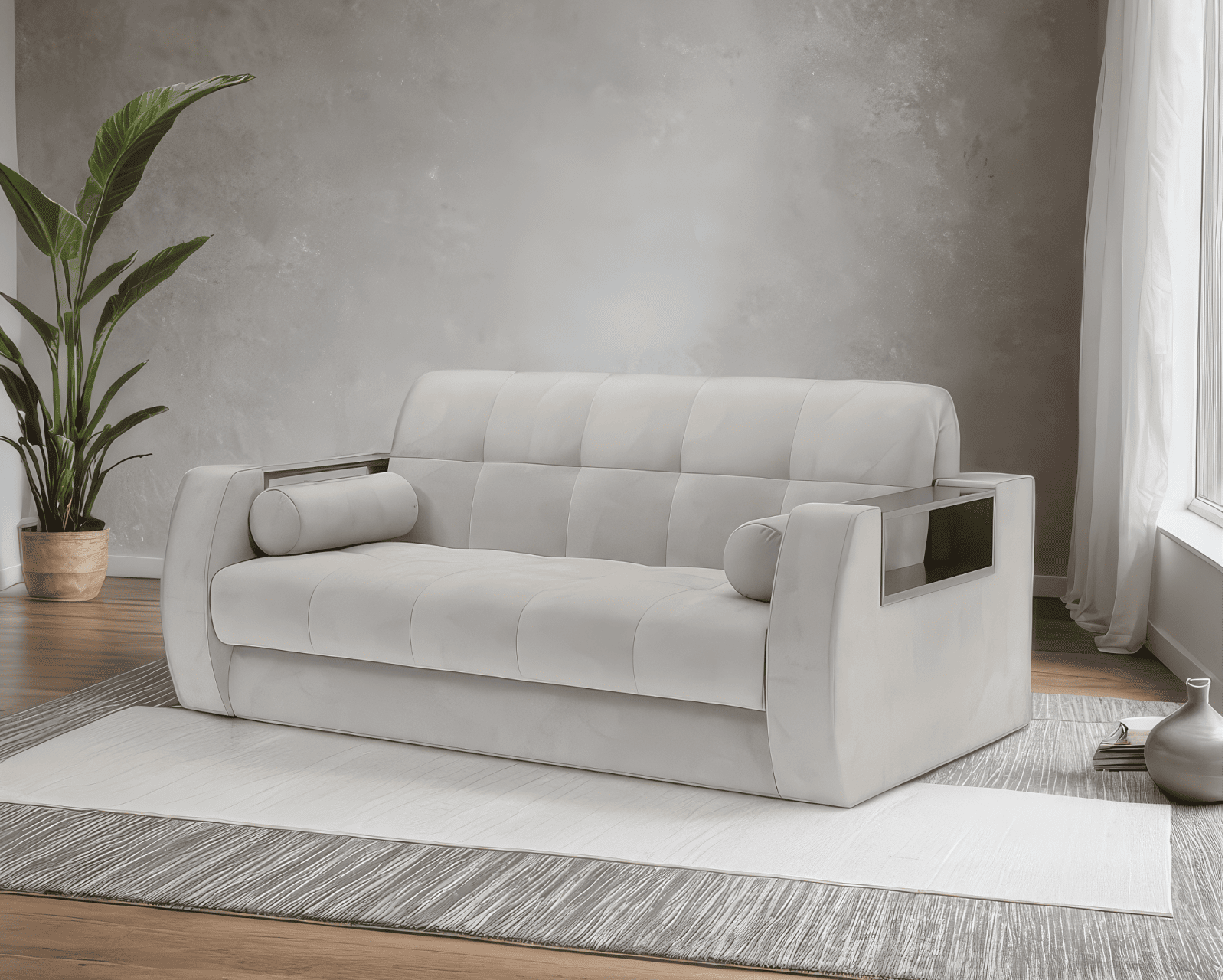 Изысканность дивану придает классическая каретная стяжка, выполненная в квадратной форме. Дополняют стильный образ пара декоративных подушек-валиков. Их можно разместить и под поясницу, и под голову, при необходимости.