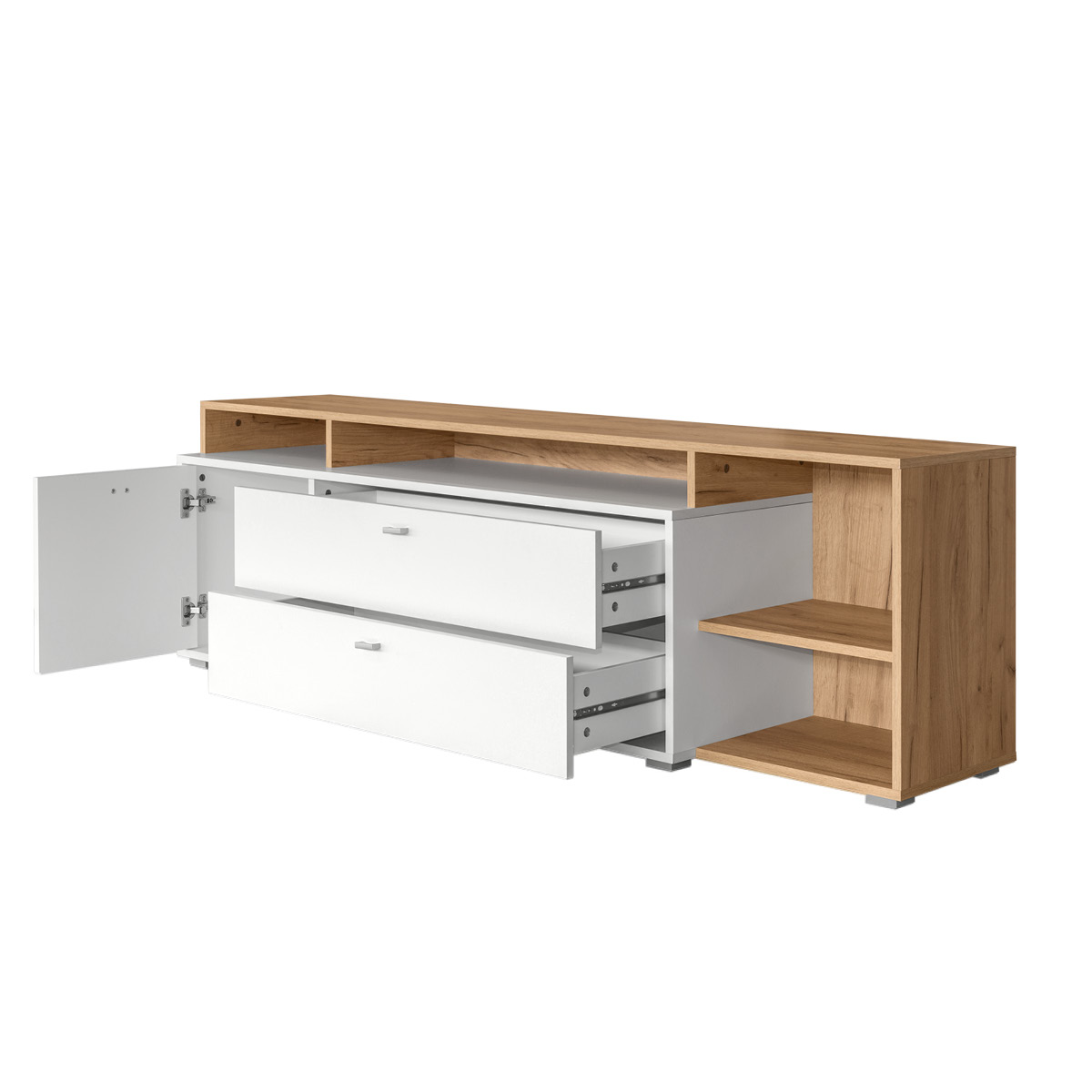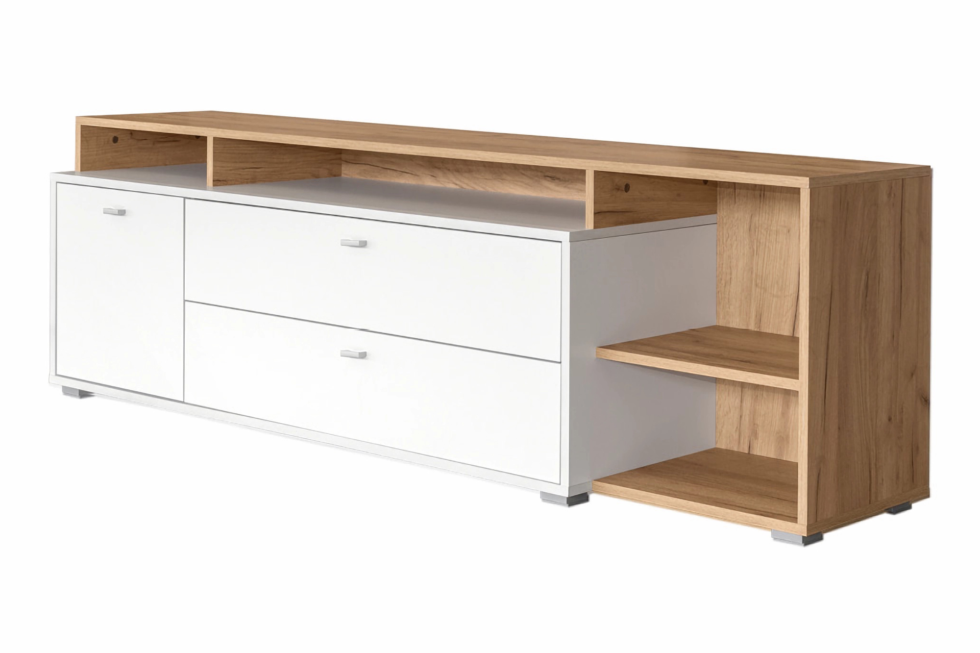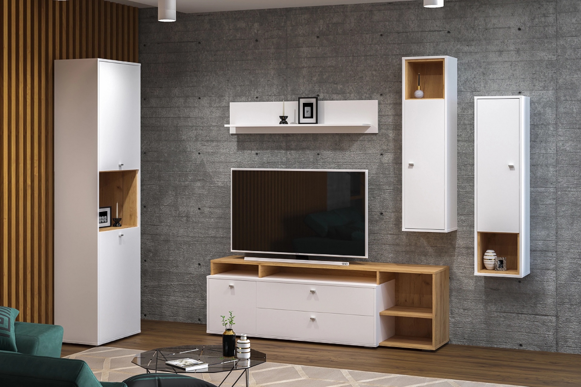 Большая тумба под подойдет для для широкоэкранного ТВ. Выдержанна в традициях стиля минимализм, сочетание модного белого цвета с теплым древесным оттенком Дуб золотой.
