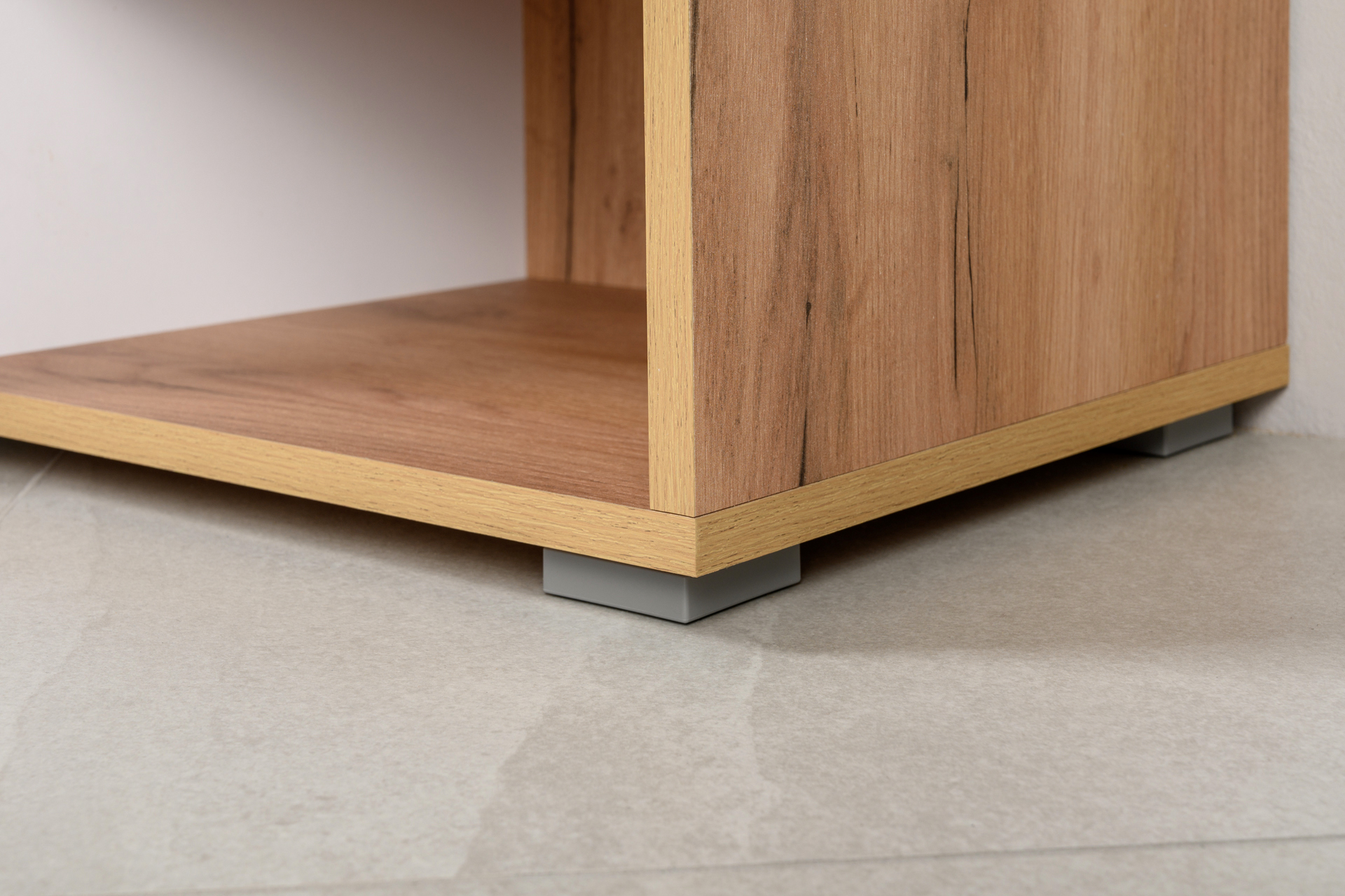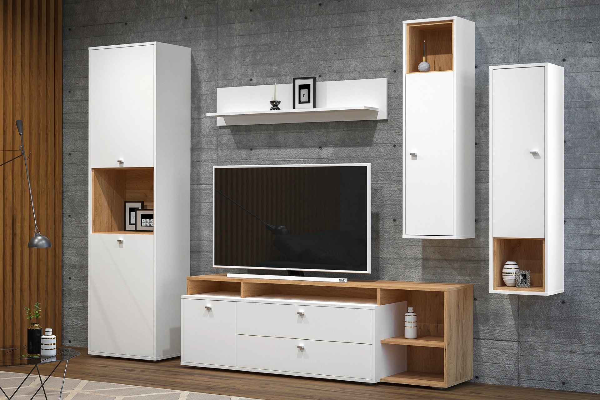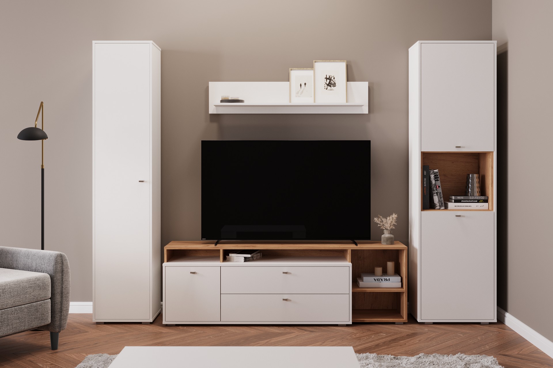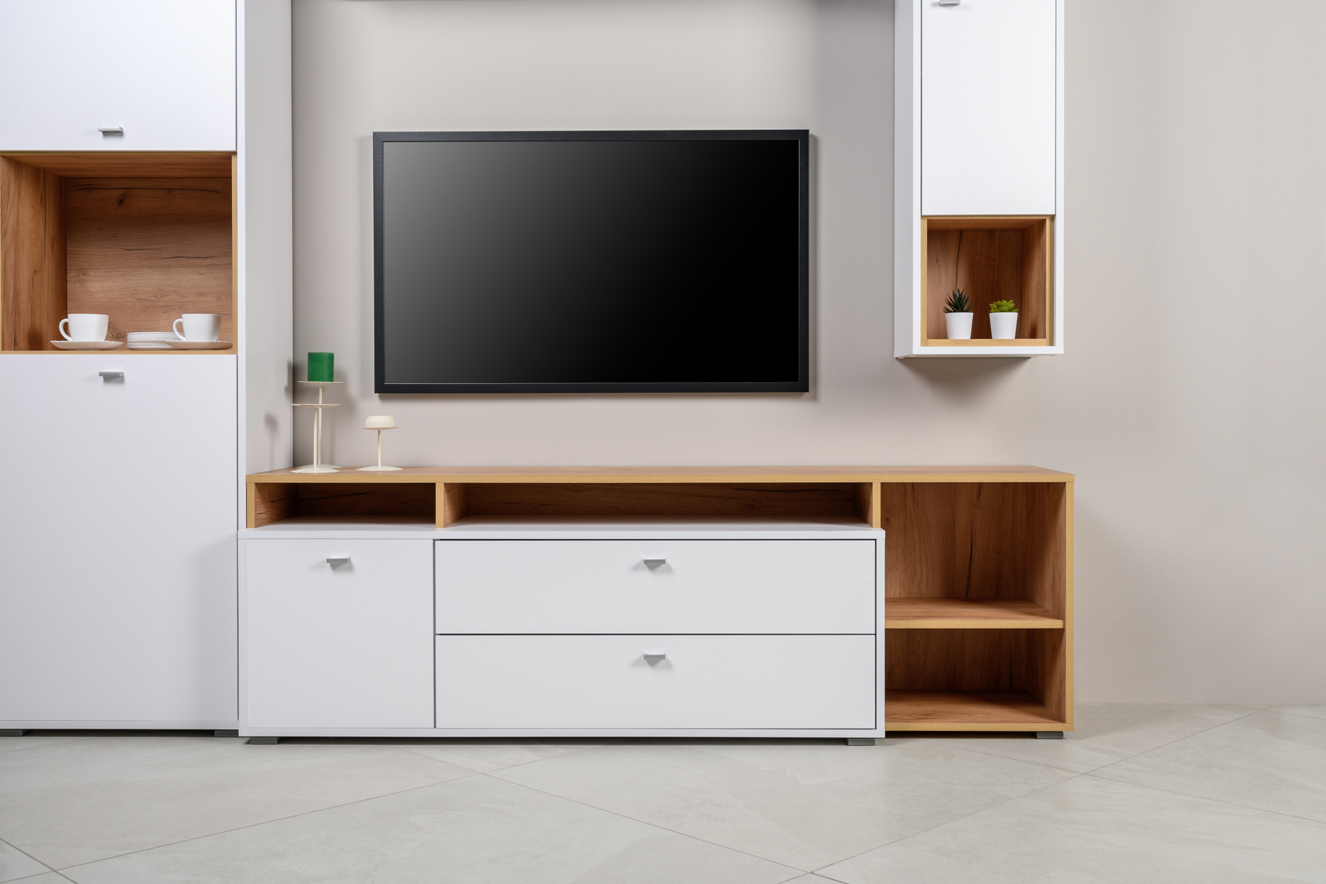 Большая тумба под подойдет для для широкоэкранного ТВ. Выдержанна в традициях стиля минимализм, сочетание модного белого цвета с теплым древесным оттенком Дуб золотой.