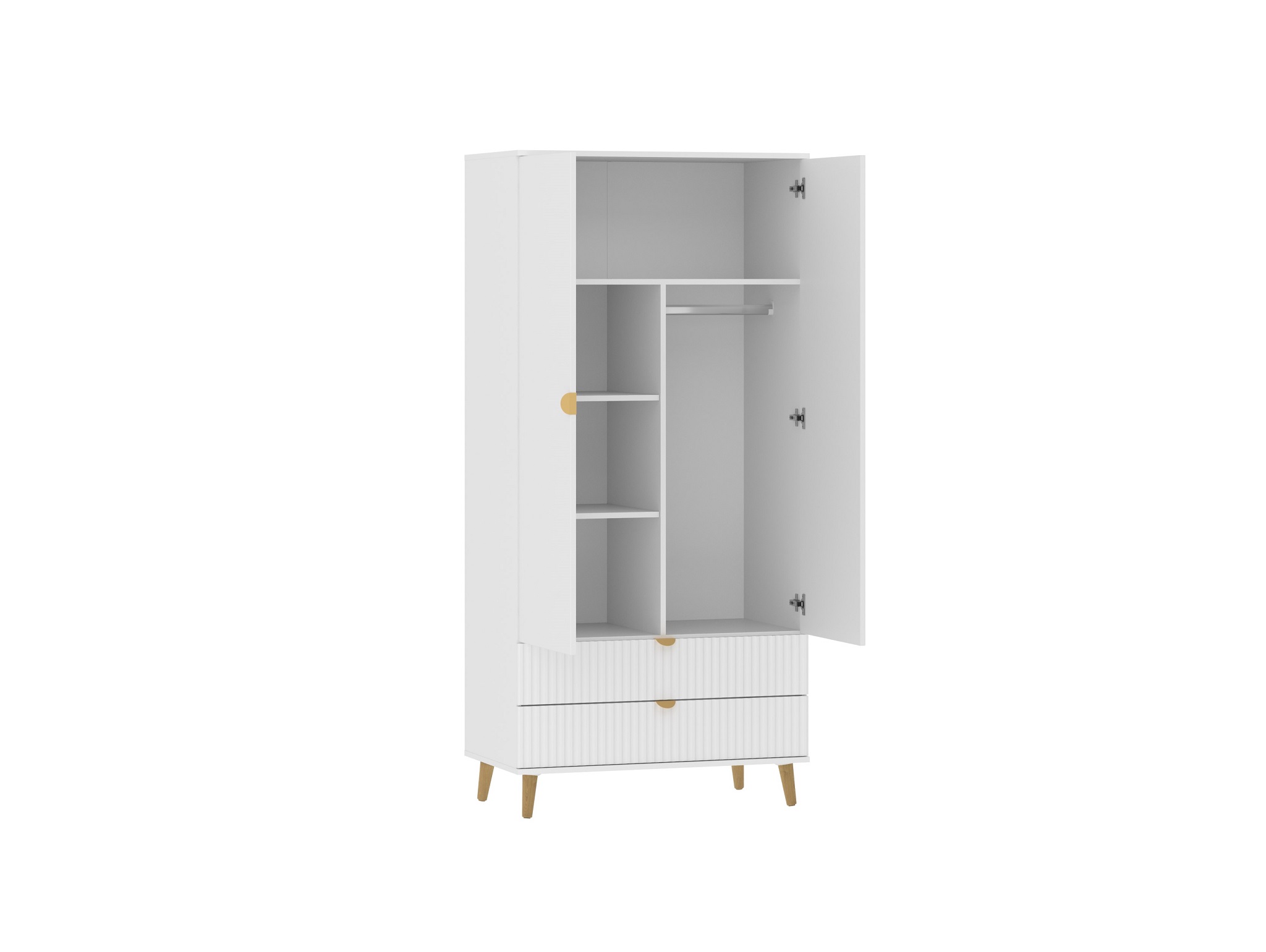 Два выдвижных ящика, полки, штанга для плечиков и антресольная полка для хранения.