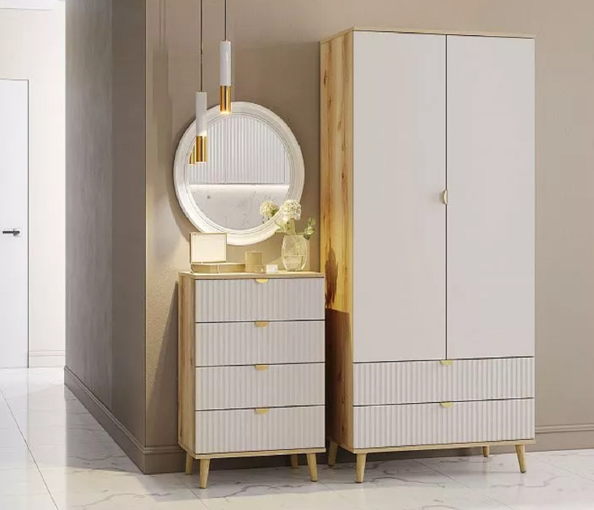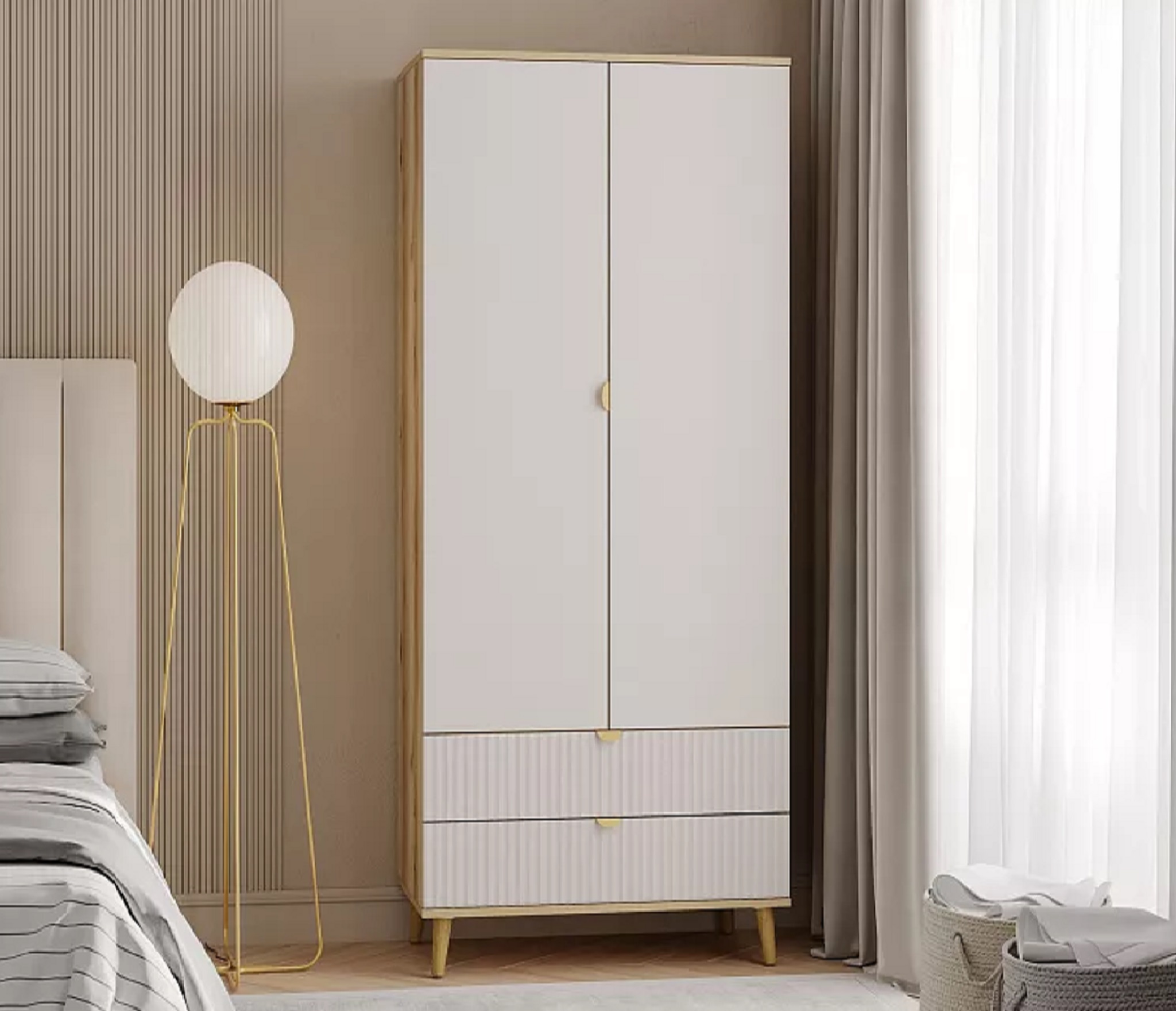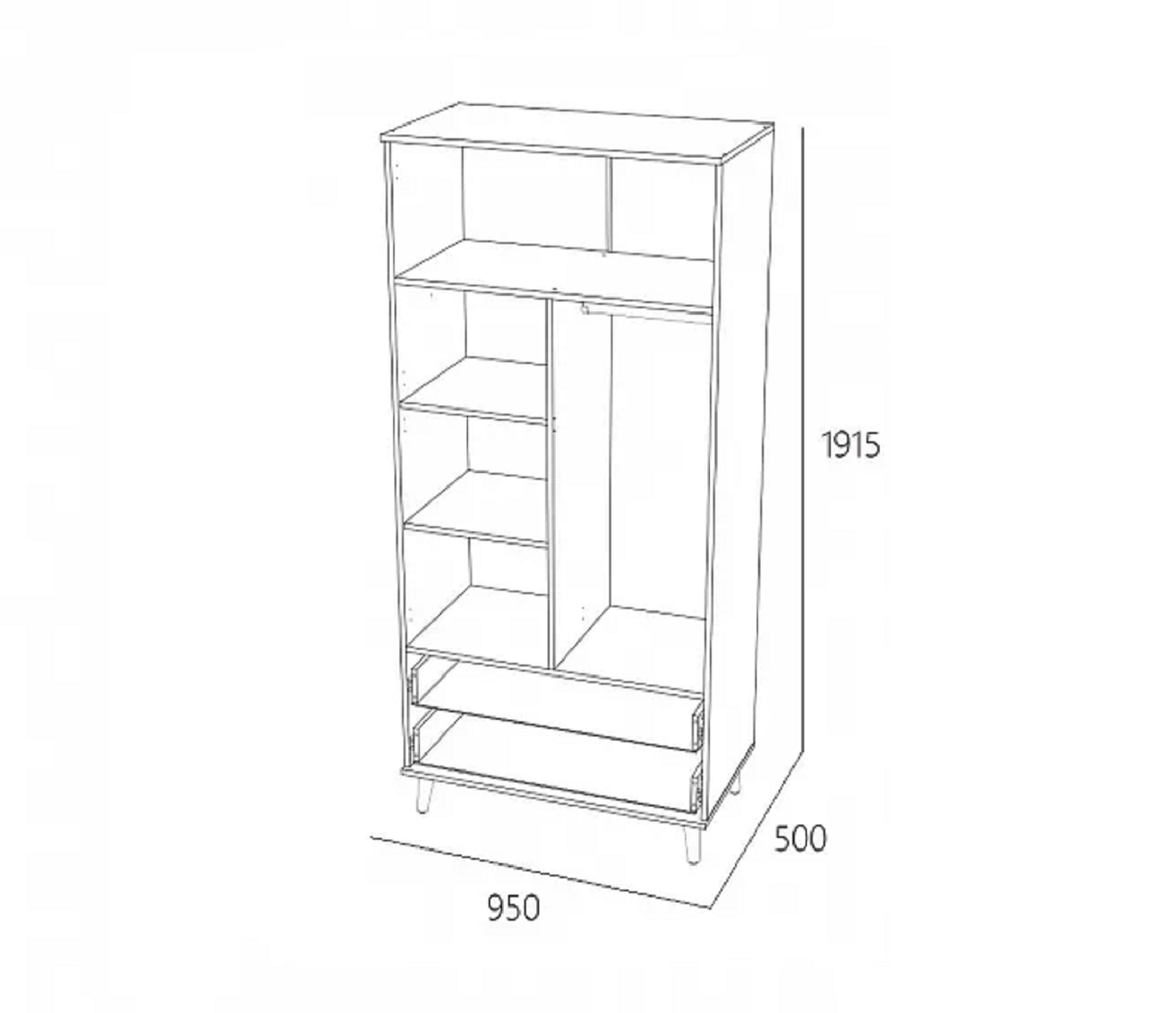 Два выдвижных ящика, полки, штанга для плечиков и антресольная полка для хранения.