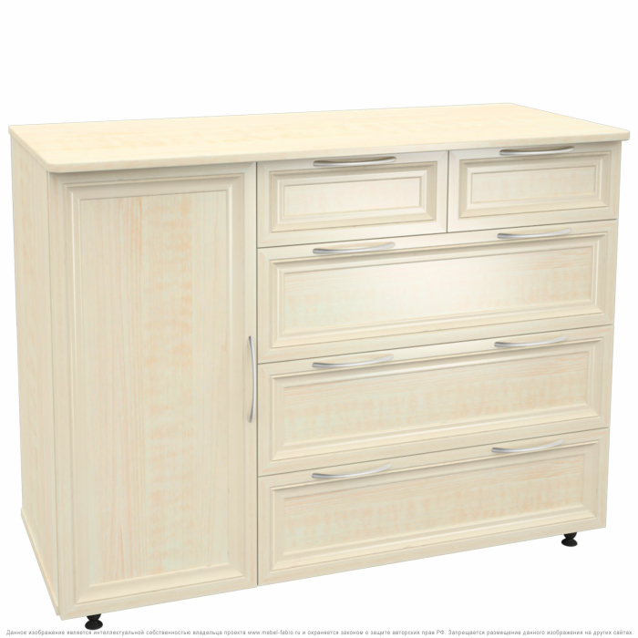 Комод 7 отличается большими размерами и многофункциональностью.3 больших+2 маленьких выдвижных ящика,позволят разместить множество вещей.Дверь,скрывающая полку,позволяет разместить более крупные вещи.Корпус из высококачественного ЛДСП,фасады рамочные МДФ.Производитель сохраняет за собой право менять фурнитуру.