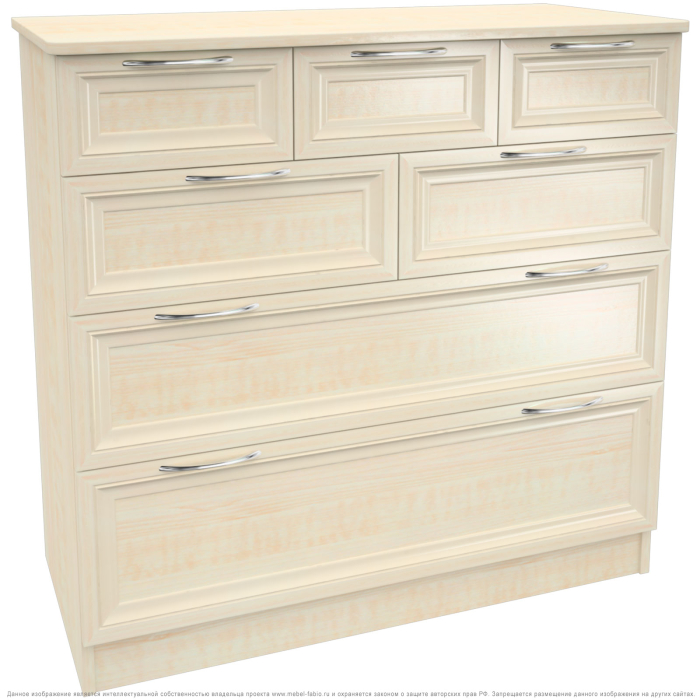 Комод 21 отличается большими размерами и многофункциональностью в использовании.Два нижних ящика больших размеров,остальные 5 размером меньше,что позволяет размещать вещи разной габаритности.Корпус ЛДСП,фасады рамочные МДФ.Производитель оставляет за собой право менять фурнитуру.