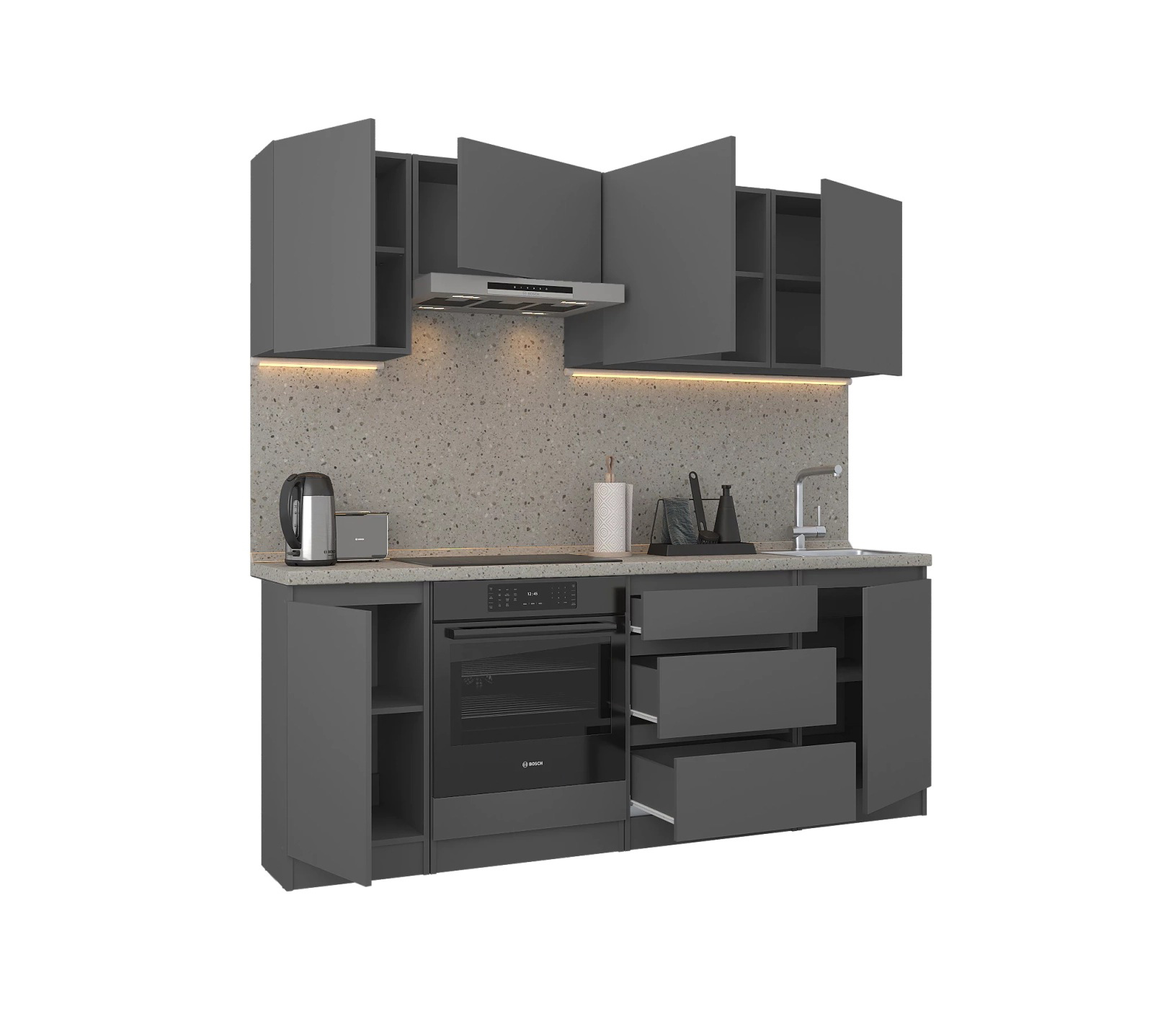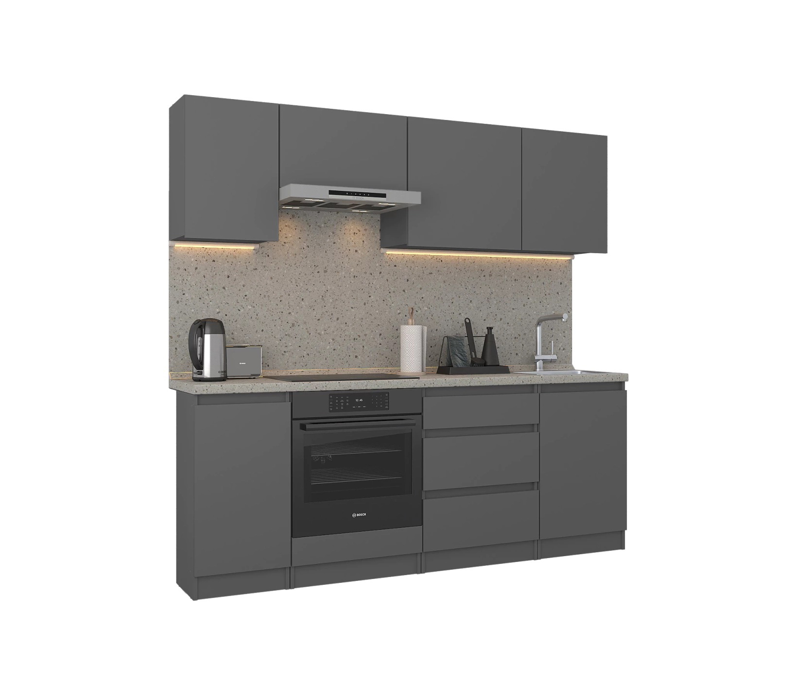 Обратите внимание, что столешница, стеновая панель, мойка и смеситель не входят в комплектацию кухни Леон и приобретаются отдельно. Это позволяет вам выбрать идеальные аксессуары и элементы для создания индивидуального дизайна вашей кухни.