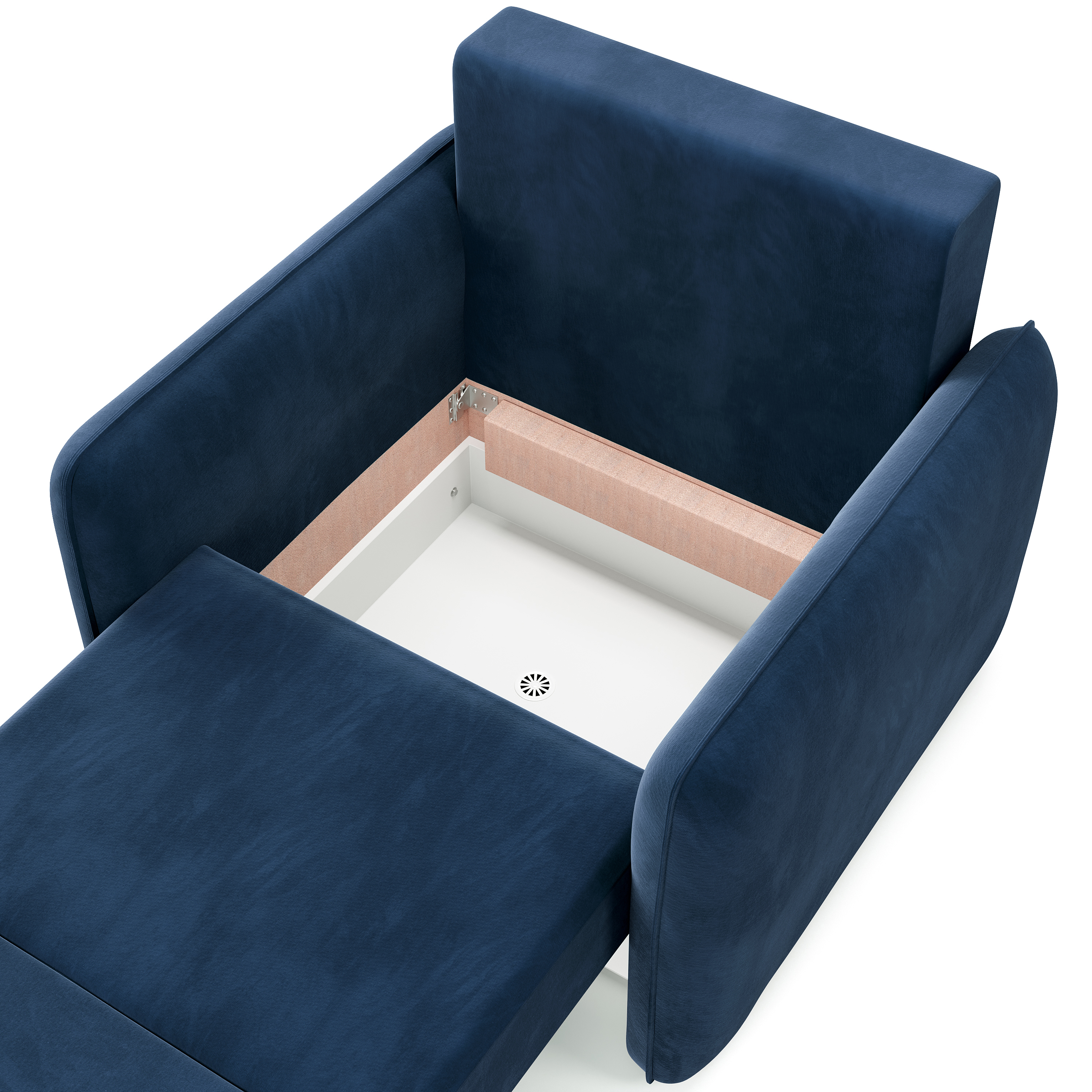 В конструкции кресла используются материалы из натурального дерева, которые гарантируют экологичность и прочность каркаса. Под сиденьем предусмотрен бельевой ящик, в который можно убрать постельное белье.
