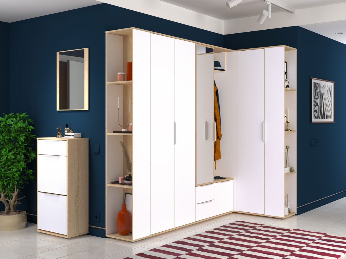 Открытая вешалка, с четырьмя крючками для одежды, имеет антресольную полку для головных уборов и распашное отделение для обуви.