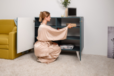 Двери оснащены доводчиками, обеспечивающими плавное и бесшумное закрытие. Регулируемые полки позволяют легко трансформировать внутреннее пространство под любые нужды. Комод украшен стильными ручками, которые подчеркивают его изысканный дизайн. Высокие опоры из натурального дерева обеспечивают удобство в уборке, продуманное до мелочей. Внутренняя поверхность фасадов, задняя стенка и ножки выполнены в белом цвете, что создает гармоничный и завершенный вид.
