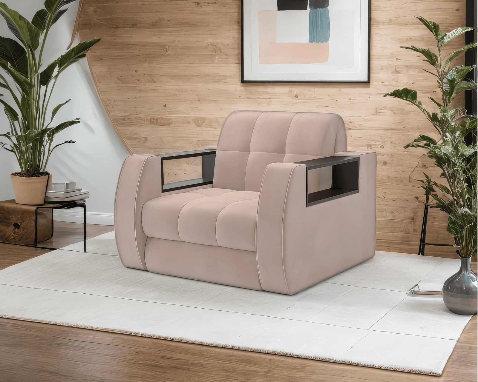 Характерной особенностью модели являются функциональные полочки, встроенные в подлокотники. Полки выполнены из ЛДСП цвета «Венге». Они вместительные и стильные. Теперь у вас не будем проблемы, чтобы разместить под рукой зарядку для телефона, пульт от ТВ или книги и не загромождать мелочевкой остальные поверхности.